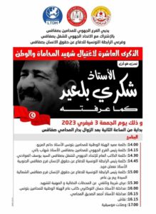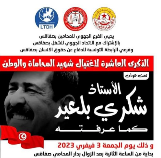 Les branches régionales de l’Ordre national des avocats, de la Ligue tunisienne pour la défense des droits de l’homme (LTDH) et de l’Union générale tunisienne du travail (UGTT) de Sfax organisent une journée de commémoration de l’assassinat du martyr Chokri Belaid ce vendredi 3 février à partir de 14h à la maison de l’avocat située à Sfax.