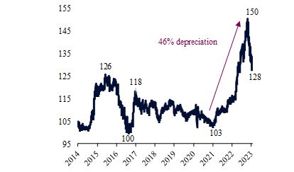 Toutefois, des changements ont été annoncés au cours des derniers trimestres. L’attitude ultra-libre de la BoJ, dans un contexte de resserrement agressif de la Réserve fédérale américaine et de la Banque centrale européenne, a favorisé les sorties de capitaux du Japon. Cela a affecté le yen japonais (JPY), qui s’est déprécié et, au point de pression maximale, en octobre de l’année dernière, a perdu 46 % de sa valeur par rapport à l’USD par rapport aux récents sommets. La forte dépréciation du yen qui vient de s’ajouter à d’autres chocs mondiaux liés à l’offre, tels que la guerre en Ukraine et la pénurie de puces, pour pousser les prix japonais à la hausse.