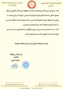 Le conseil de l’ONAT a appelé, par la même occasion, à la nécessité d’établir des réformes structurelles urgentes au niveau du cadre juridique réglementaire de l’Institut, et ce, en impliquant l’Ordre National des Avocats Tunisiens en tant que partenaire majeur en matière de : « la mise en œuvre des programmes visant à perfectionner l’expérience des avocats en exercice, le fonctionnement, l’élaboration des programmes d’études et l’encadrement des apprenants.
