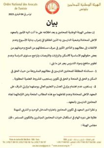 Le conseil de l’Ordre national des avocats tunisiens (ONAT) a exprimé, dans un communiqué, son soutien inconditionnel avec les élèves-avocats à l’Institut supérieur de la profession d’avocat (ISPA) qui sont en grève illimitée depuis le 30 janvier 2023 pour un ensemble de revendications, notamment le doit à la bourse, le droit au logement, le droit aux stages et l’amélioration des conditions de formation et à la vacance de certains postes importants à l’institut.