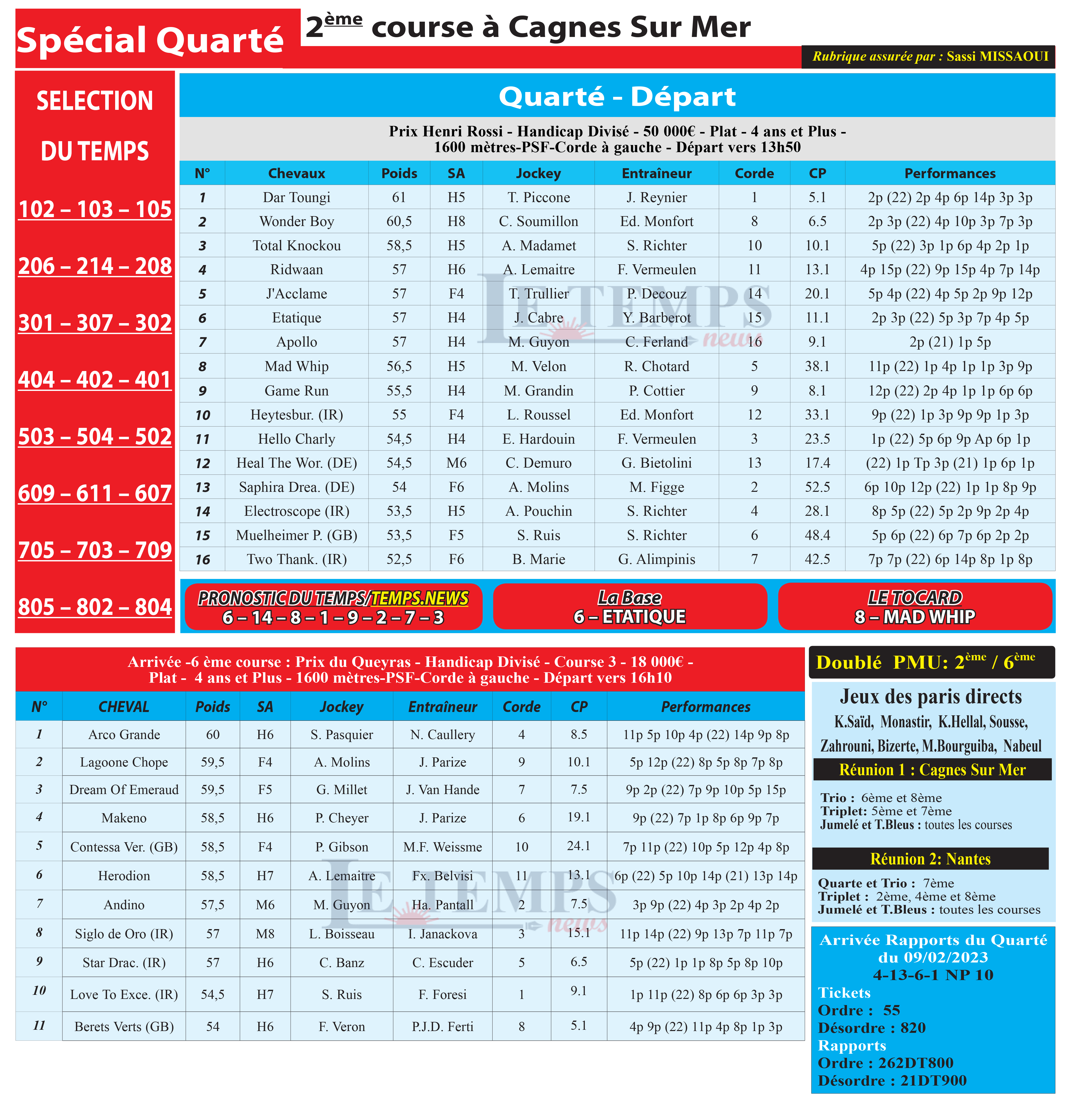 Partager Facebook Twitter LinkedIn Pinterest Email Notre spécial Quarté d’aujourd’hui, 2ème course à Cagnes Sur Mer, donne notre pronostic du Temps/ Temps News avec le cheval n°6 Etatique étant la base, tandis que le Tocard est le cheval n°8 Mad Whip. PMU Turf