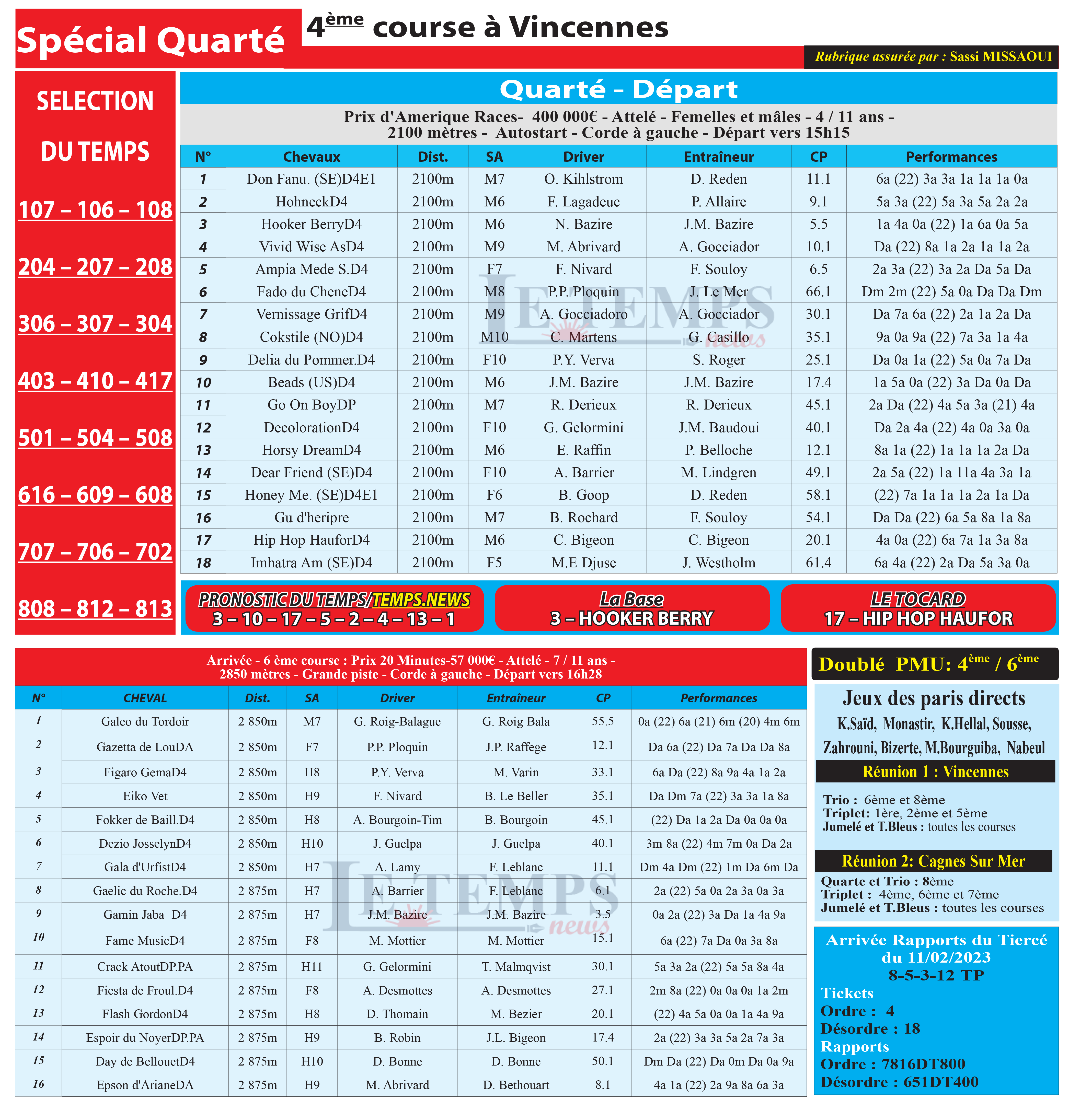 Notre spécial Quarté d’aujourd’hui, 4ème course à Vincennes, donne notre pronostic du Temps/ Temps News avec le cheval n°3 Hooker Berry étant la base, tandis que le Tocard est le cheval n°17 Hip Hop Haufor.