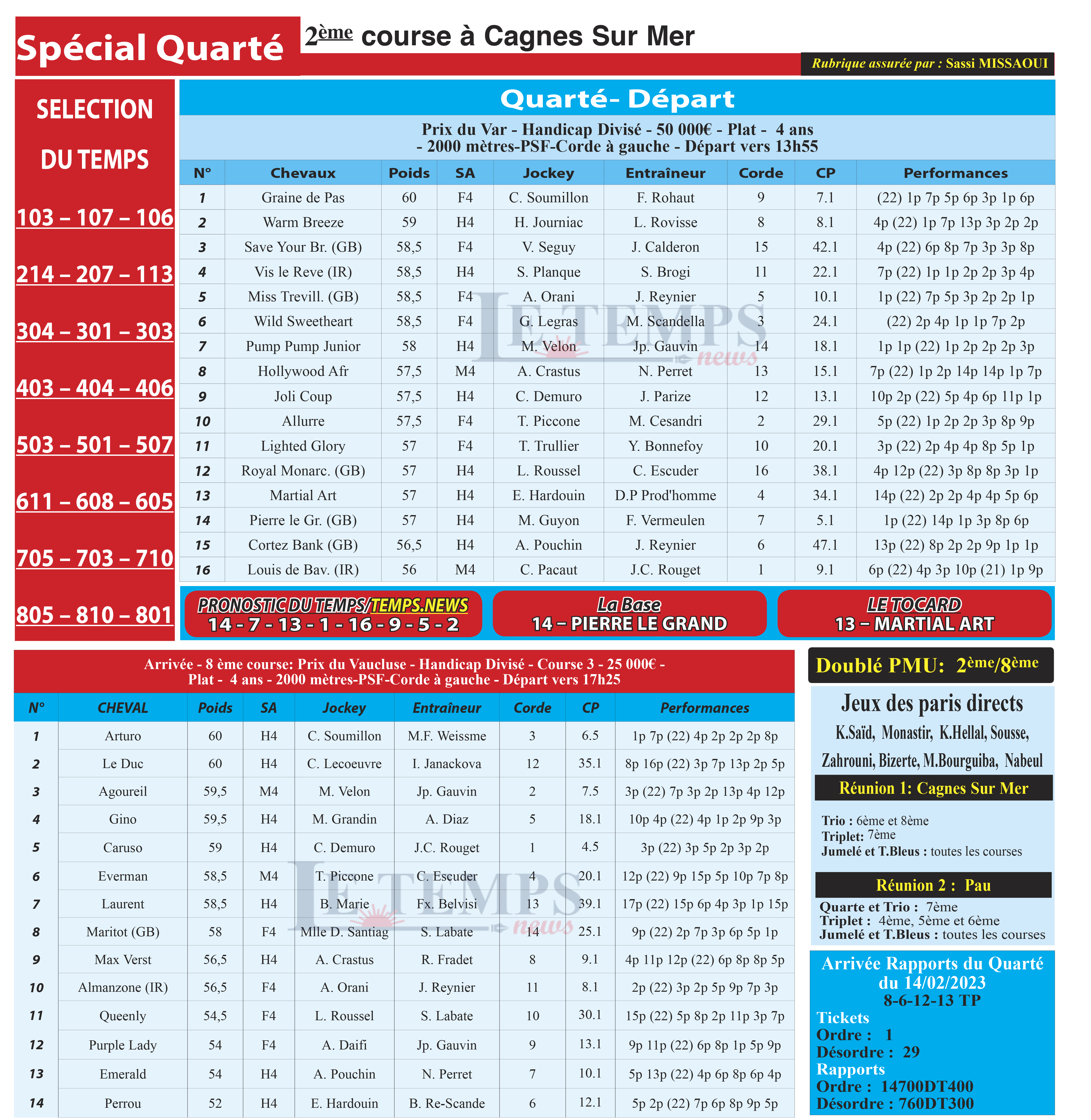 Partager Facebook Twitter LinkedIn Pinterest Email Notre spécial Quarté d’aujourd’hui, 2ème course à Cagnes Sur Mer, donne notre pronostic du Temps/ Temps News avec le cheval n°14 Pierre Le Grand étant la base, tandis que le Tocard est le cheval n°13 Martial Art. PMU Turf
