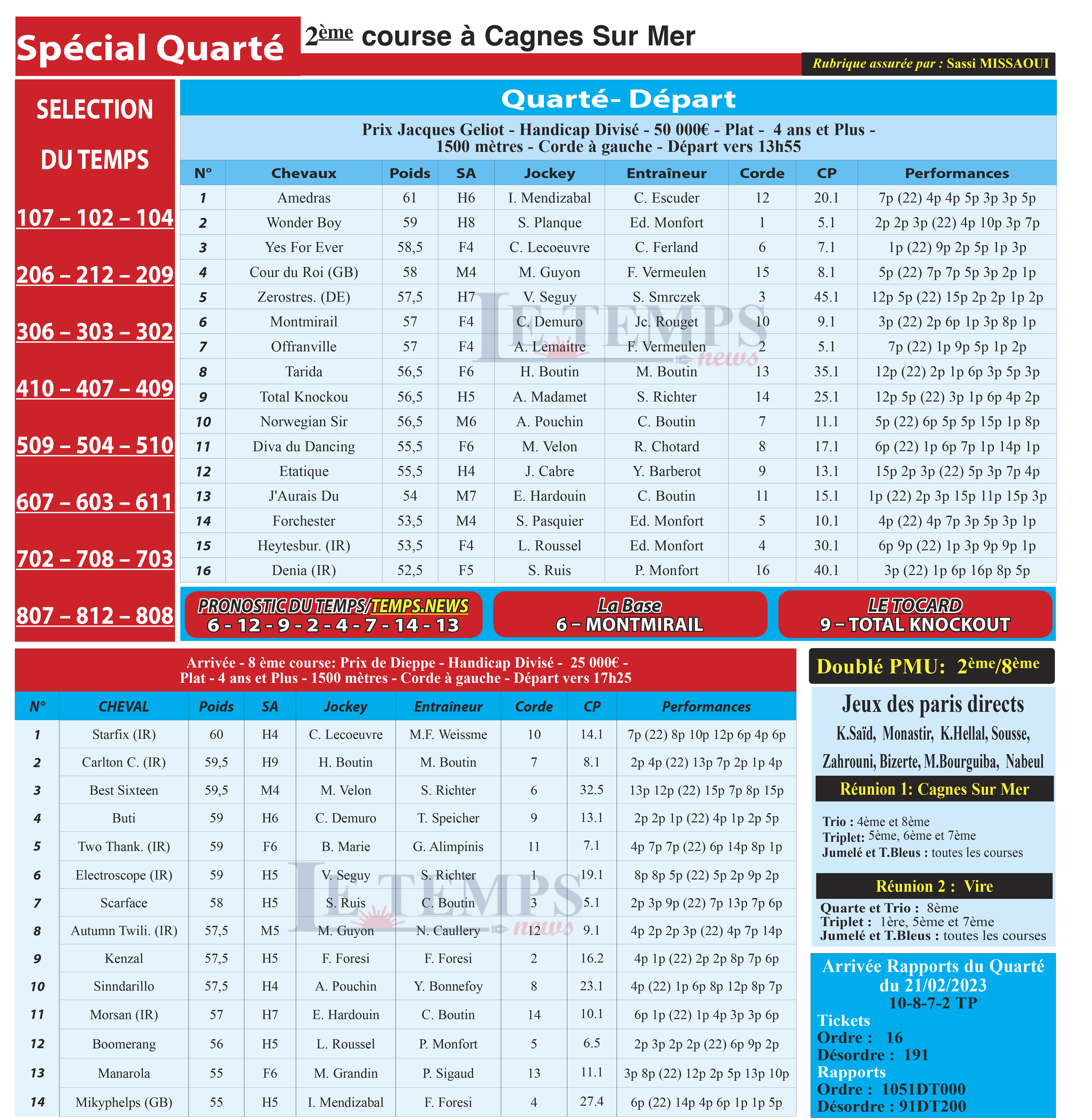 Partager Facebook Twitter LinkedIn Pinterest Email Notre spécial Quarté d’aujourd’hui, 2ème course à Cagnes Sur Mer, donne notre pronostic du Temps/ Temps News avec le cheval n°14 Pierre Le Grand6 Montmirail étant la base, tandis que le Tocard est le cheval n°9 Total Knockout. PMU Turf