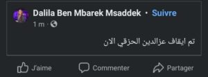Partager Facebook Twitter LinkedIn Pinterest Email Dans une publication partagée sur sa page Facebook officielle, l’avocate Dalila Ben Mbarek Msadak a indiqué que son père, l’activiste politique Ezzedine Hezgui a été arrêté sans citer d’autres détails ou circonstances. Rym arrestation