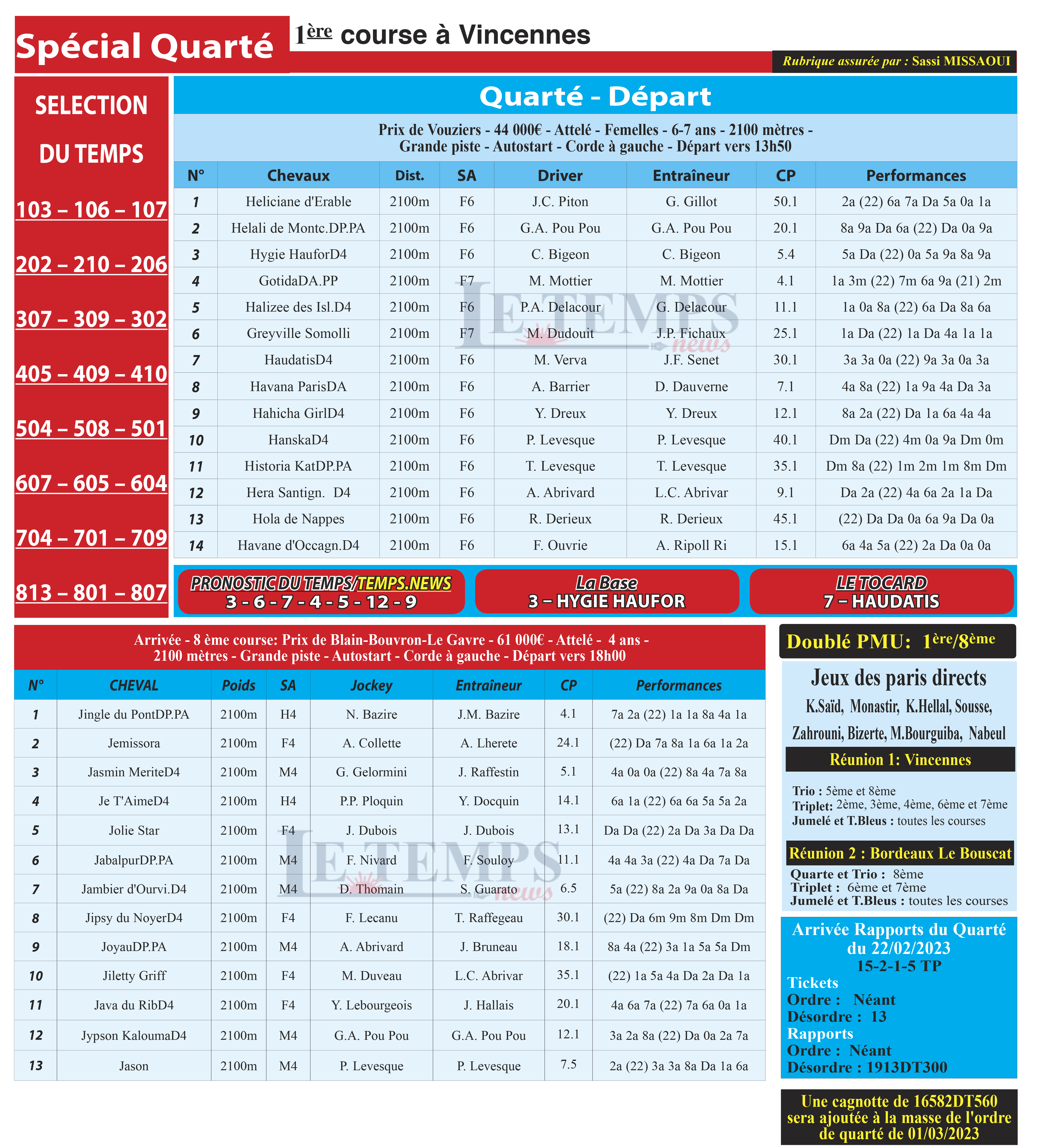 Partager Facebook Twitter LinkedIn Pinterest Email Notre spécial Quarté d’aujourd’hui, 1ère course à Vincennes, donne notre pronostic du Temps/ Temps News avec le cheval n°3 Hygie Haufor étant la base, tandis que le Tocard est le cheval n°7 Haudatis. PMU Turf