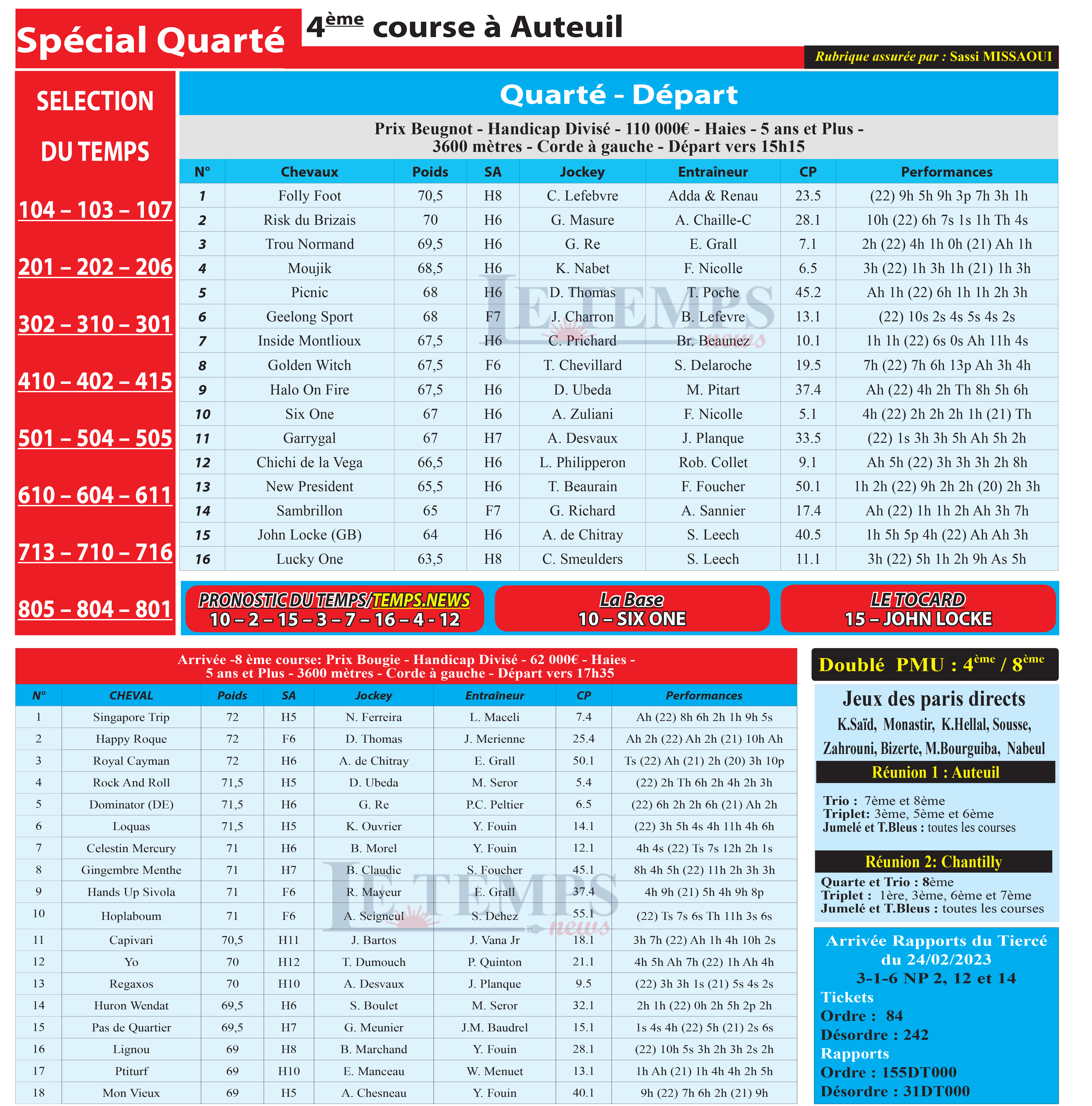 Notre spécial Quarté d’aujourd’hui, 4ème course à Auteuil, donne notre pronostic du Temps/ Temps News avec le cheval n°10 Six One étant la base, tandis que le Tocard est le cheval n°15 John Locke.
