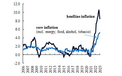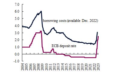 Enfin, les retards traditionnels entre les hausses de taux d’intérêt et leurs effets sur l’économie globale sont particulièrement longs dans la zone euro, ce qui exige une prudence accrue de la part des décideurs politiques. La succession sans précédent de hausses de taux s’est déjà traduite par une augmentation des coûts d’emprunt pour les entreprises, ce qui commencera à peser sur l’investissement cette année, mais les effets prendront du temps à se matérialiser pleinement. Les entreprises européennes sont très dépendantes du crédit bancaire et une plus petite proportion de leur dette est émise sur les marchés, ce qui contraste avec le secteur des entreprises américaines qui est globalement plus tributaire des marchés de la dette. La répercussion des changements de taux de la politique monétaire sur les taux d’intérêt des prêts bancaires est généralement plus lente, ce qui implique que les effets complets du cycle de resserrement sur les conditions de crédit ne sont pas encore achevés, car la politique monétaire peut prendre plus de 5 trimestres avant d’être complètement ressentie par les entreprises et les ménages. En outre, les coûts d’emprunt ont augmenté pour les ménages, ce qui aura un effet cette année sur l’investissement en logement et la consommation. Des délais plus longs signifient une plus grande incertitude quant à l’impact des mesures de politique économique, ce qui, dans une période de grande volatilité économique et inflationniste, justifie une pause dans le cycle de resserrement agressif de la politique monétaire pour une évaluation plus approfondie.