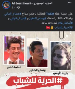 D’après une publication partagée par Al Jomhouri sur sa page Facebook officielle ce mardi, le 28 février, Sghaier, Ghoulem et Khelifi vont être détenus pendant 48h. Il est important de noter, à cet égard, que les activistes Wissem Sghaier et Oussama Ghoulem étaient auparavant membres du PDP et du parti Al Jomhouri et font maintenant partie du comité de soutien de Issam Chebbi.