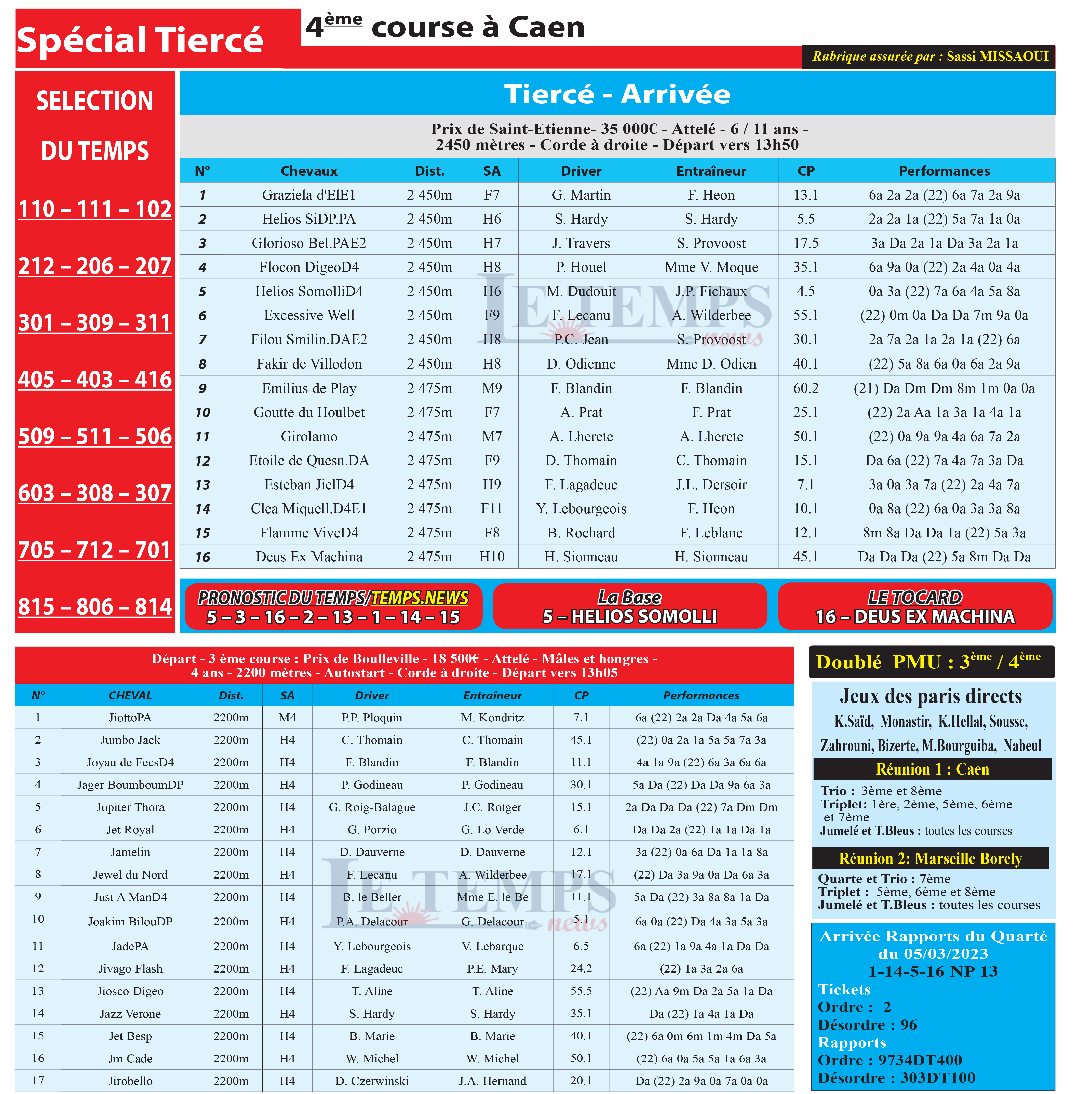 Partager Facebook Twitter LinkedIn Pinterest Email Notre spécial Tiercé d’aujourd’hui, 4ème course à Caen, donne notre pronostic du Temps/ Temps News avec le cheval n°5 Helios Somolli étant la base, tandis que le Tocard est le cheval n°16 Deux Ex Machina. PMU Turf