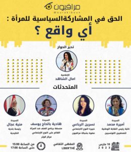 En marge de la célébration de la Journée internationale des droits des femmes, le réseau Mourakiboun organise ce vendredi 10 mars 2023, un débat autour du droit à la participation politique des femmes dans l’un des cafés culturels situés à Tunis. La journaliste Amel Chahed a été chargée d’animer ce débat. Parmi les intervenant.e.s : Nesrine Rebaï, membre du réseau Mourakiboun et experte en genre, et Amira Mohamed, vice-présidente du Syndicat national des journalistes tunisiens (SNJT).