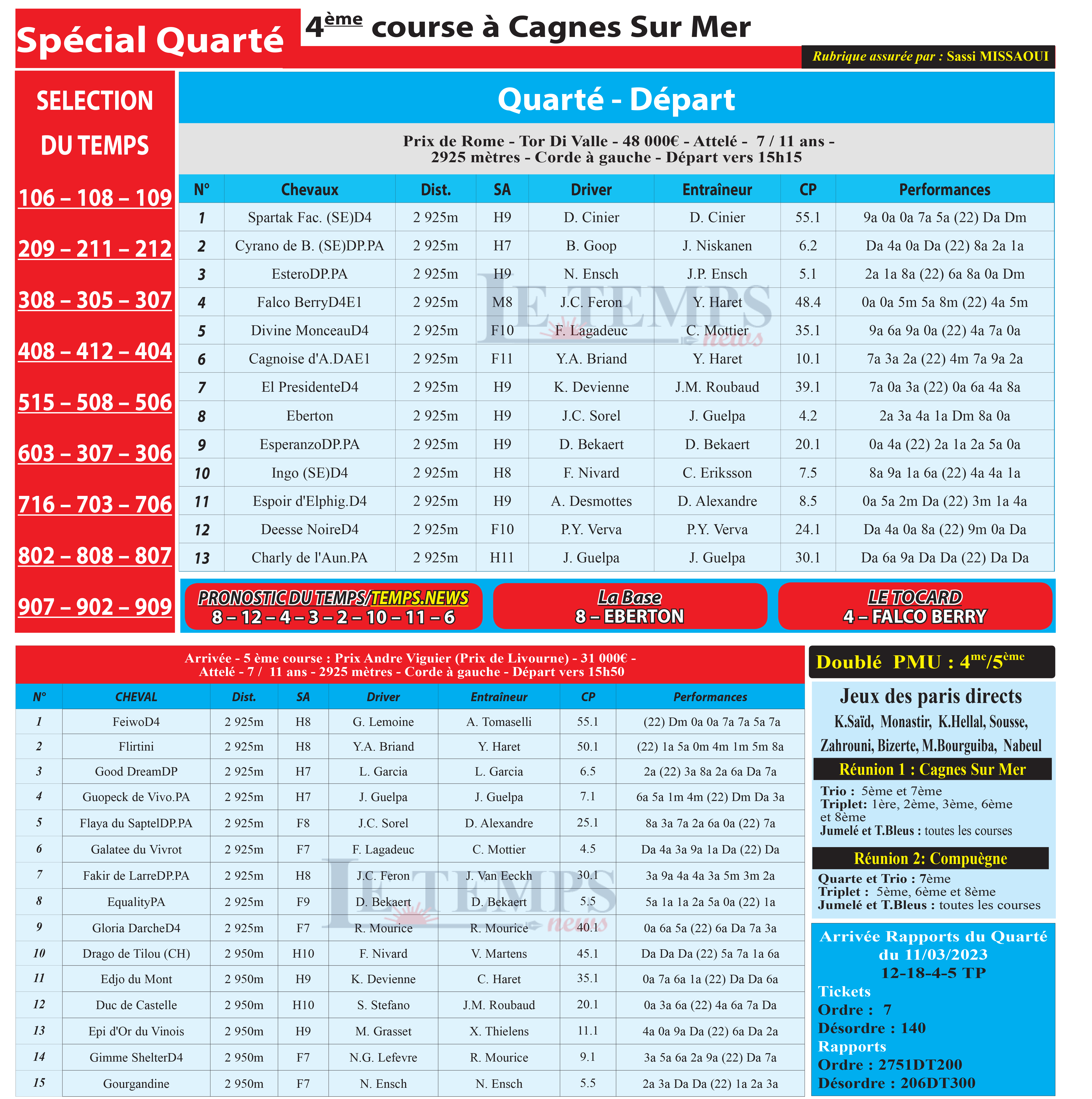 Partager Facebook Twitter LinkedIn Pinterest Email Notre spécial Quarté d’aujourd’hui, 4ème course à Cagnes Sur Mer, donne notre pronostic du Temps/ Temps News avec le cheval n°8 Eberton étant la base, tandis que le Tocard est le cheval n°4 Falco Berry. PMU Turf