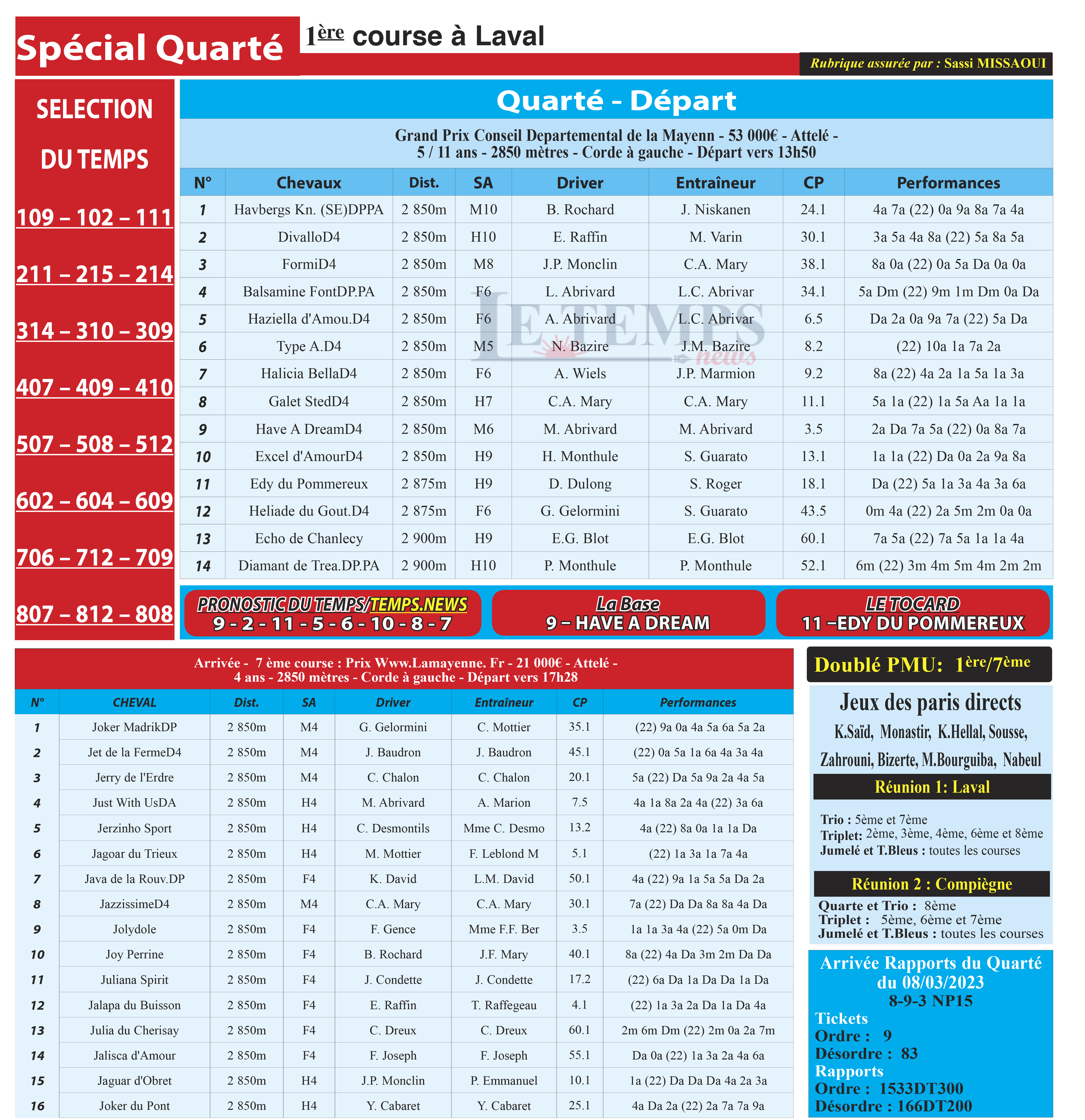 Notre spécial Quarté d’aujourd’hui, 1ère course à Laval, donne notre pronostic du Temps/ Temps News avec le cheval n°9 Have A Dream étant la base, tandis que le Tocard est le cheval n°11 Edy Du Pommereux.
