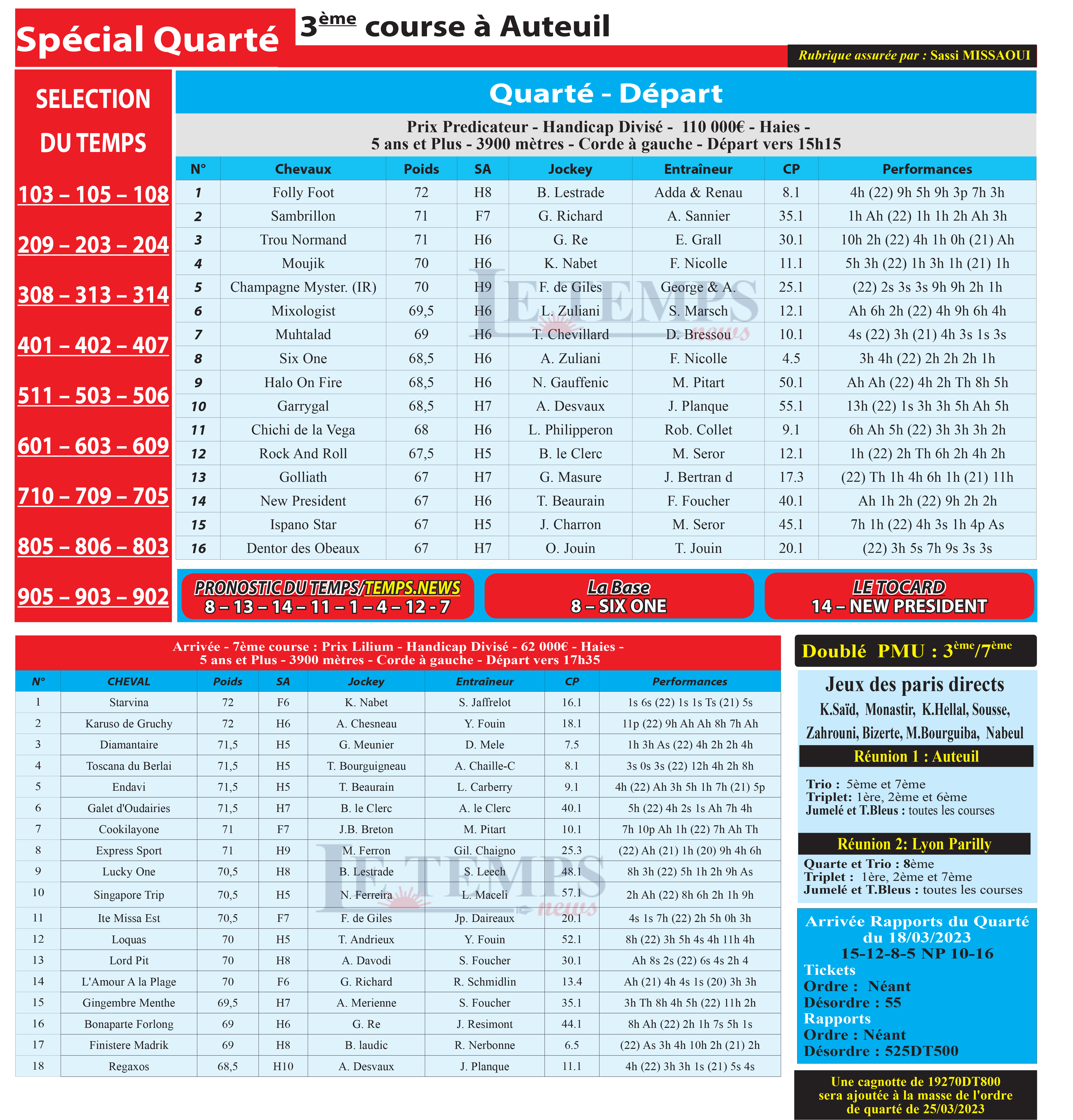 Partager Facebook Twitter LinkedIn Pinterest Email Notre spécial Quarté d’aujourd’hui, 3ème course à Auteuil, donne notre pronostic du Temps/ Temps News avec le cheval n°8 Six One étant la base, tandis que le Tocard est le cheval n°14 New President. PMU Turf