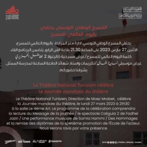 Sous la direction de Moez Mrabet, le Théâtre National Tunisien, a annoncé sur sa page Facebook officielle, qu’il célèbre la Journée mondiale du théâtre ce lundi 27 mars, à la salle du 4ème Art de Tunis à partir de 21h30. Le programme de la soirée comprend d’abord la lecture du « Message de la journée », rédigé par le Théâtre National, suivie de représentation de la pièce « Caligula 2 » de Fadhel Jaziri. Ce spectacle théâtral sera suivi par une performance musicale animée par Samia El Hammi. Des hommages et la remise des diplômes de la 7ème promotion de l’École de l’acteur font aussi partie du programme de cette soirée.
