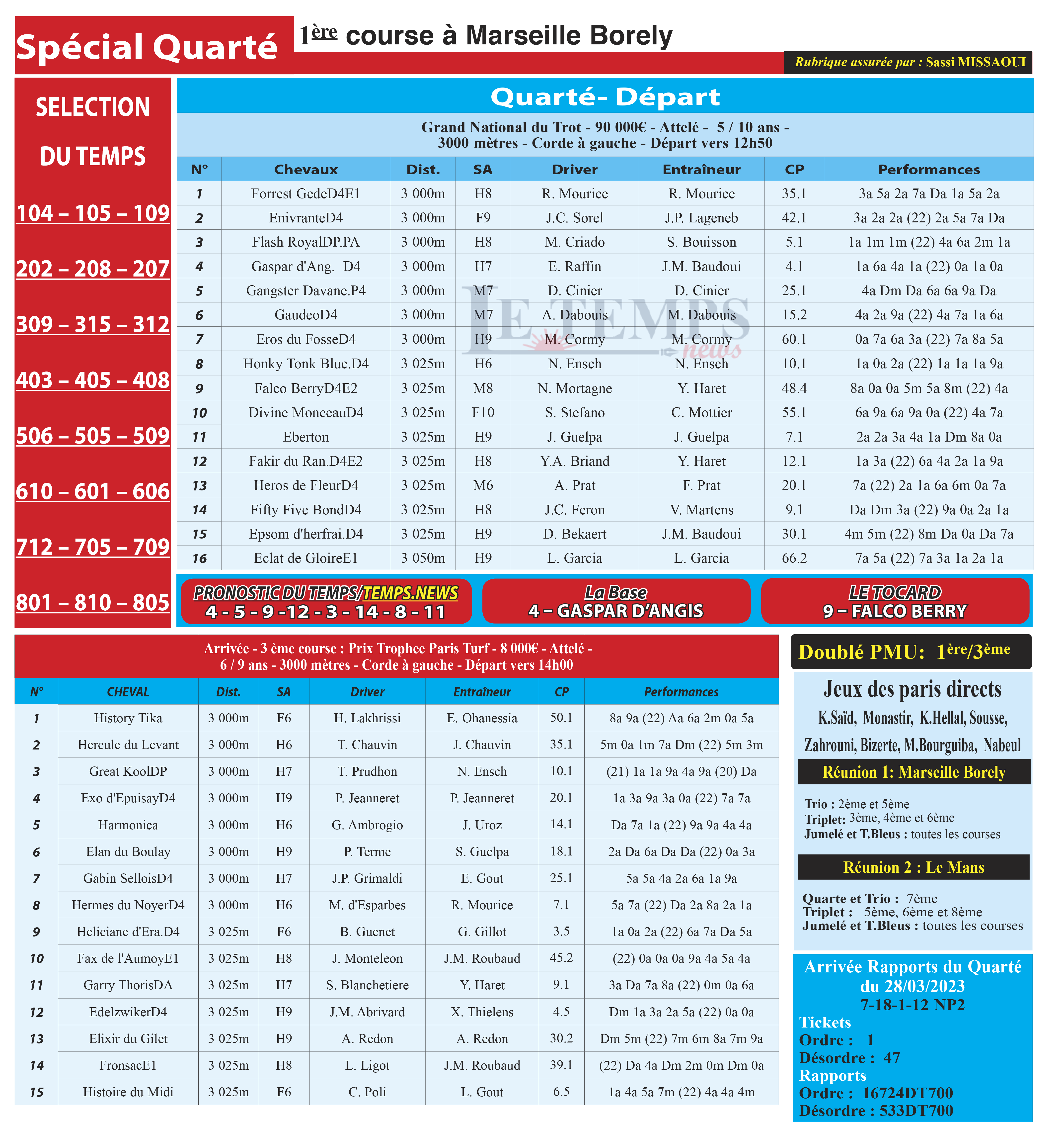 Partager Facebook Twitter LinkedIn Pinterest Email Notre spécial Quarté d’aujourd’hui, 1ère course à Marseille Borely, donne notre pronostic du Temps/ Temps News avec le cheval n°4 Gaspar D’Angis étant la base, tandis que le Tocard est le cheval n°9 Falco Berry. PMU Turf