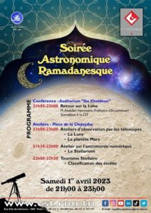 À l’approche du rendez-vous historique où des astronautes vont repartir vers la lune, 50 ans après la dernière mission lunaire Apollo, la Cité des Sciences à Tunis organise, samedi 1er avril 2023, une soirée ramadanesque astronomique, et ce, en partenariat avec la Société astronomique de Tunisie.
