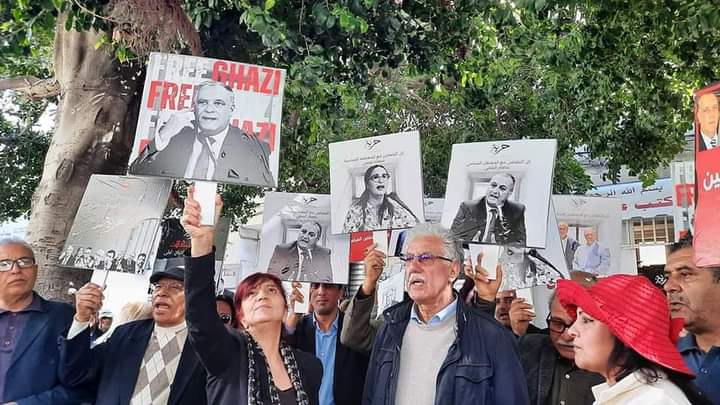 Les manifestants et manifestantes ont porté les photos de l’activiste politique Jawher Ben Mbarek, l’ancien secrétaire général du Courant Démocrate Ghazi Chaouachi, le dirigeant au Front de Salut Ridha Belhadj, l’avocat et activiste Lazher Akremi, l’ancien dirigeant au Mouvement Ennahdha Abdelhamid Jelassi, l’activiste Chaima Issa, et l’ancien dirigeant au parti Ettakatol Mohamed Khayam Turki.