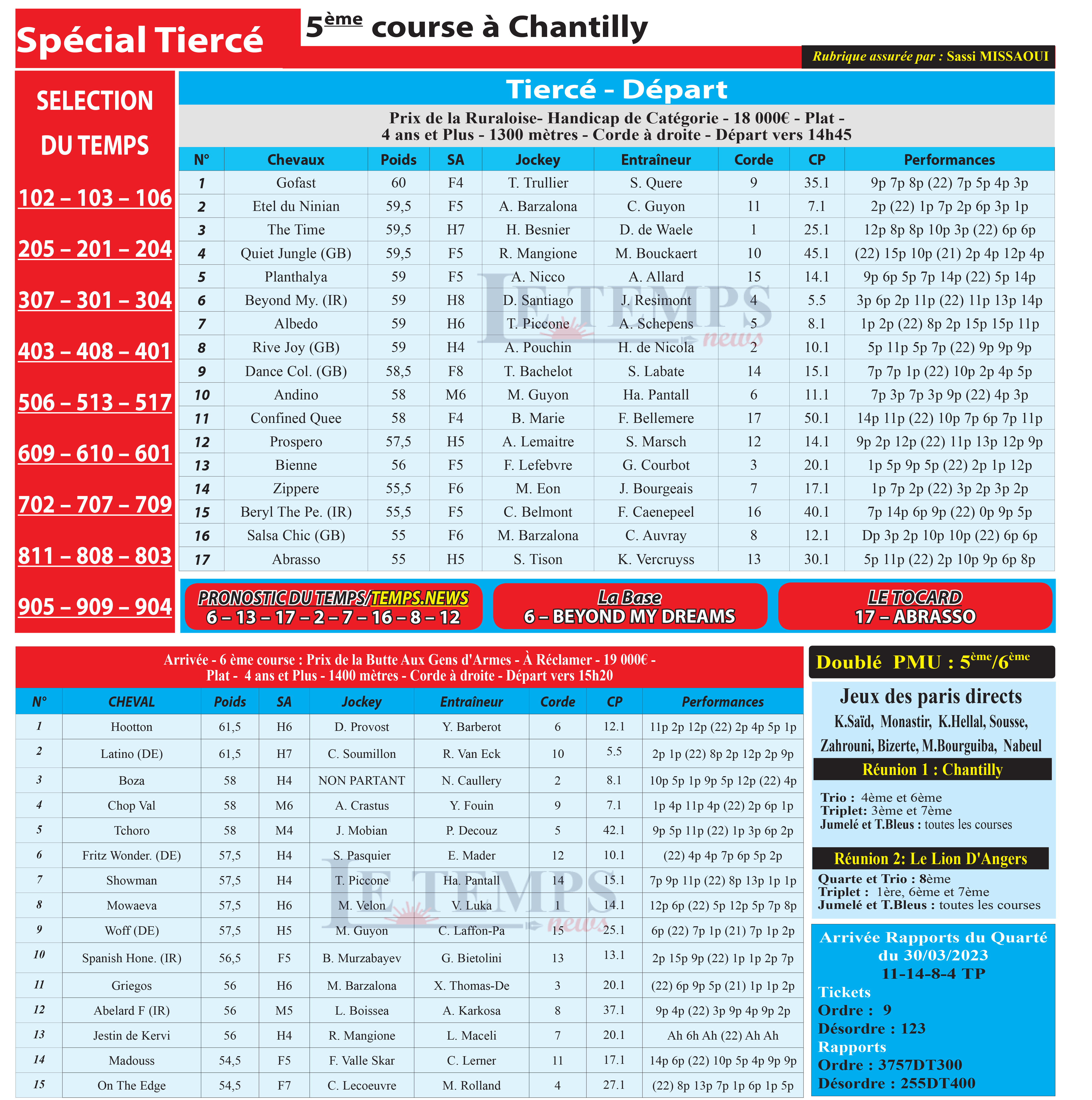 Partager Facebook Twitter LinkedIn Pinterest Email Notre spécial Tiercé d’aujourd’hui, 5ème course à Chantilly, donne notre pronostic du Temps/ Temps News avec le cheval n°6 Beyond My Dreams étant la base, tandis que le Tocard est le cheval n°17 Abrasso. PMU Turf