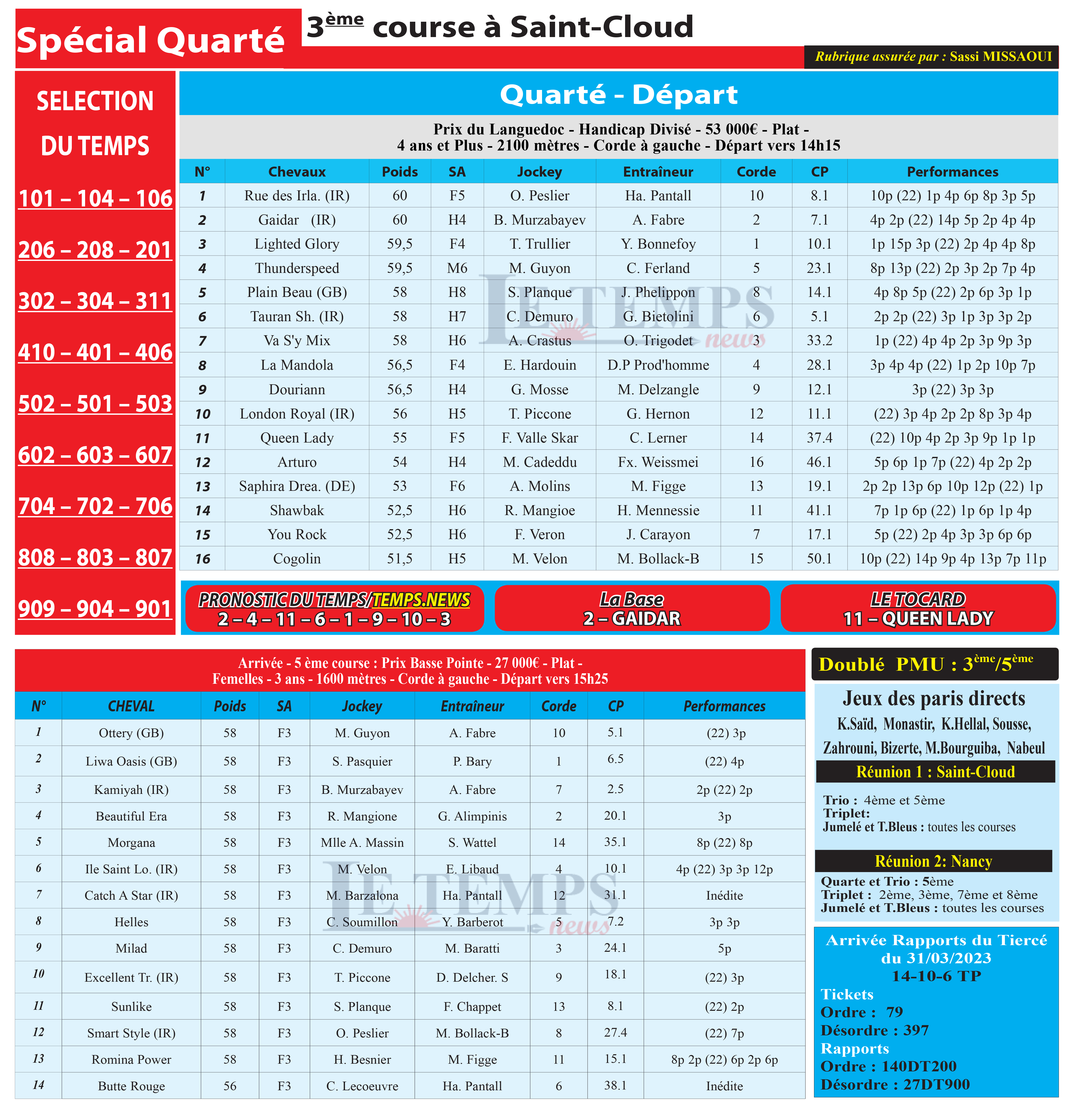 Notre spécial Quarté d’aujourd’hui, 3ème course à Saint-Cloud, donne notre pronostic du Temps/ Temps News avec le cheval n°2 Gaidar  étant la base, tandis que le Tocard est le cheval n°11 Queen Lady.