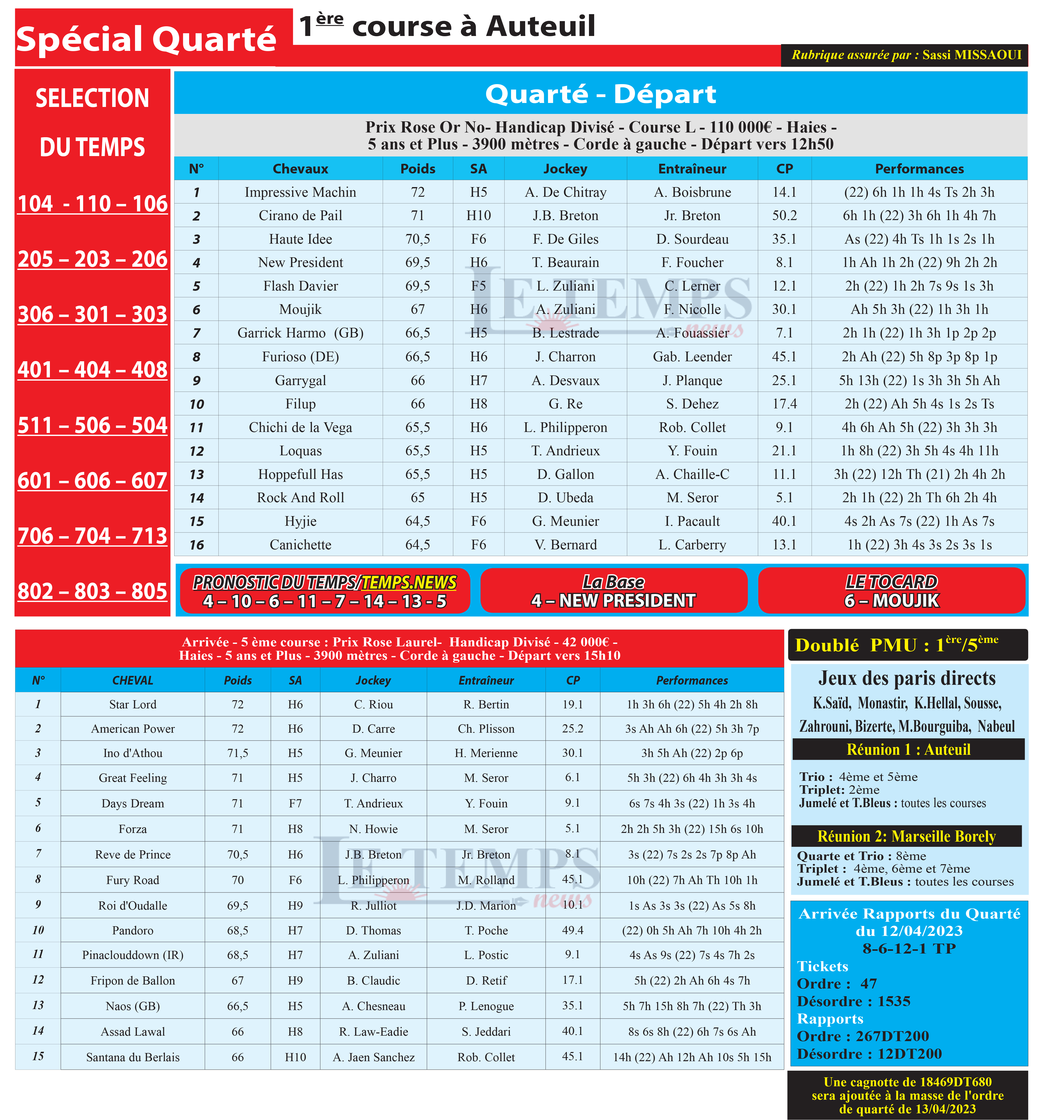 Notre spécial Quarté d’aujourd’hui, 1ère course à Auteuil, donne notre pronostic du Temps/ Temps News avec le cheval n°4 New President étant la base, tandis que le Tocard est le cheval n°6 Moujik.