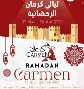 D’autre part, divers événements ramadanesques ont été organisés dans certains espaces culturels, à l’instar de : l’espace culturel Carmen ( situé à Ben Laasal de Tunis ) et l’espace El Duende ( situé à Ennasr de Tunis ) où des soirées animées par les artistes Yasser Jradi, Lobna Noomen, Mouna Chtourou et Raoudha Abdallah ont été organisés les 10, 15, 16 et 17 avril 2023.