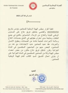 L’Ordre national des avocats tunisiens (ONAT) a indiqué, dans un communiqué datant du 25 avril et publié ce vendredi matin, qu’une équipe de défense composée de certains membres du conseil de l’Ordre et d’un groupe d’avocats spécialisés en droit pénal a été formée au niveau national, pour s’engager à défendre tous les avocats qui font l’objet de poursuites judiciaires.
