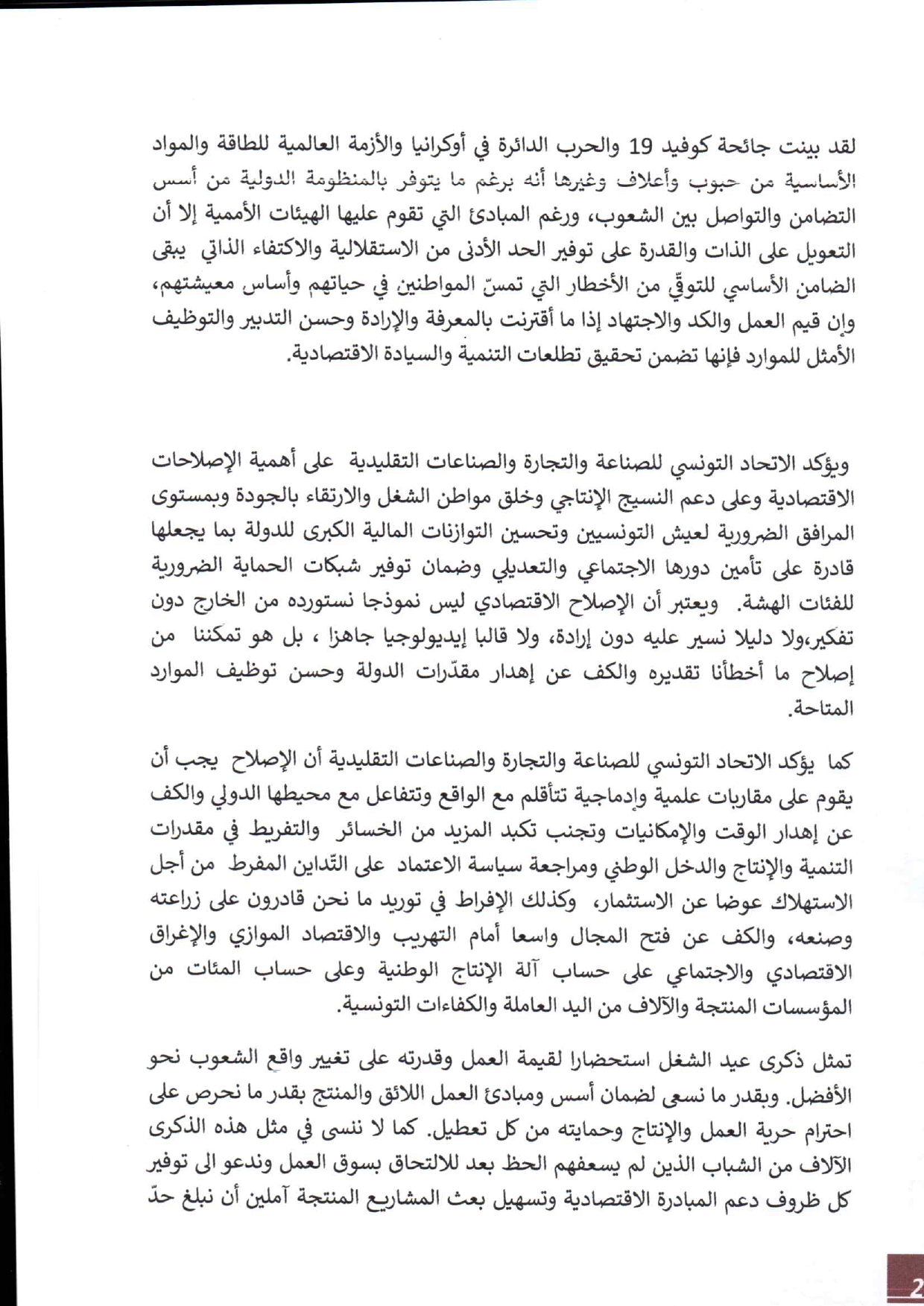 L’Union tunisienne de l’industrie, du commerce et de l’artisanat affirme qu’il ne sera pas possible de remédier à ces situations et d’améliorer la situation du pays et de sa population si nous continuons à subir les pressions des intérêts étroits, des calculs erronés et des accords commerciaux inéquitables. Il est important de souligner que parier sur les ressources humaines tunisiennes reste le meilleur moyen de réaliser un développement global, équitable et durable, et constitue le meilleur critère pour construire une société cultivée et solide, dont les piliers sont le travail, l’éthique et les valeurs, ainsi que l’arme la plus importante pour remporter les batailles économiques et renforcer la compétitivité et la durabilité de l’entreprise tunisienne.