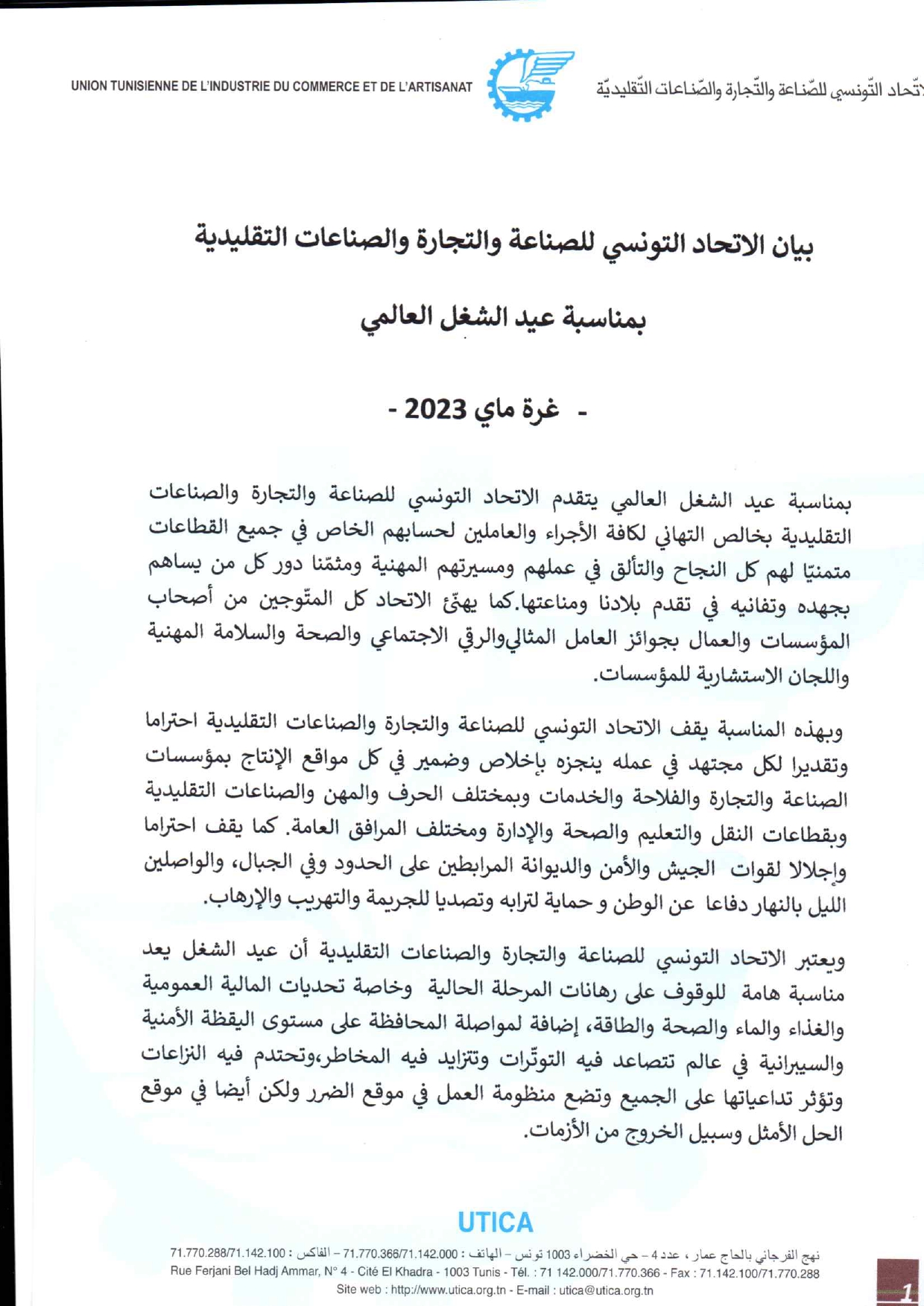 Le 1er mai , l’UTICA a considéré que la fête du travail est une occasion importante pour se pencher sur les défis actuels, en particulier ceux liés aux finances publics , à l’alimentation, à l’eau, à la santé et à l’énergie. De plus, elle vise à maintenir un niveau de vigilance élevé en matière de sécurité et de cybersécurité dans un monde où les tensions augmentent, les risques s’intensifient et les conflits éclatent, ayant des répercussions sur tout le monde et affectant le système de travail. Cependant, « cette journée est également une occasion pour trouver des solutions optimales et des moyens de sortir de ces crises., lit-on dans un communiqué publié sur sa page officielle. »