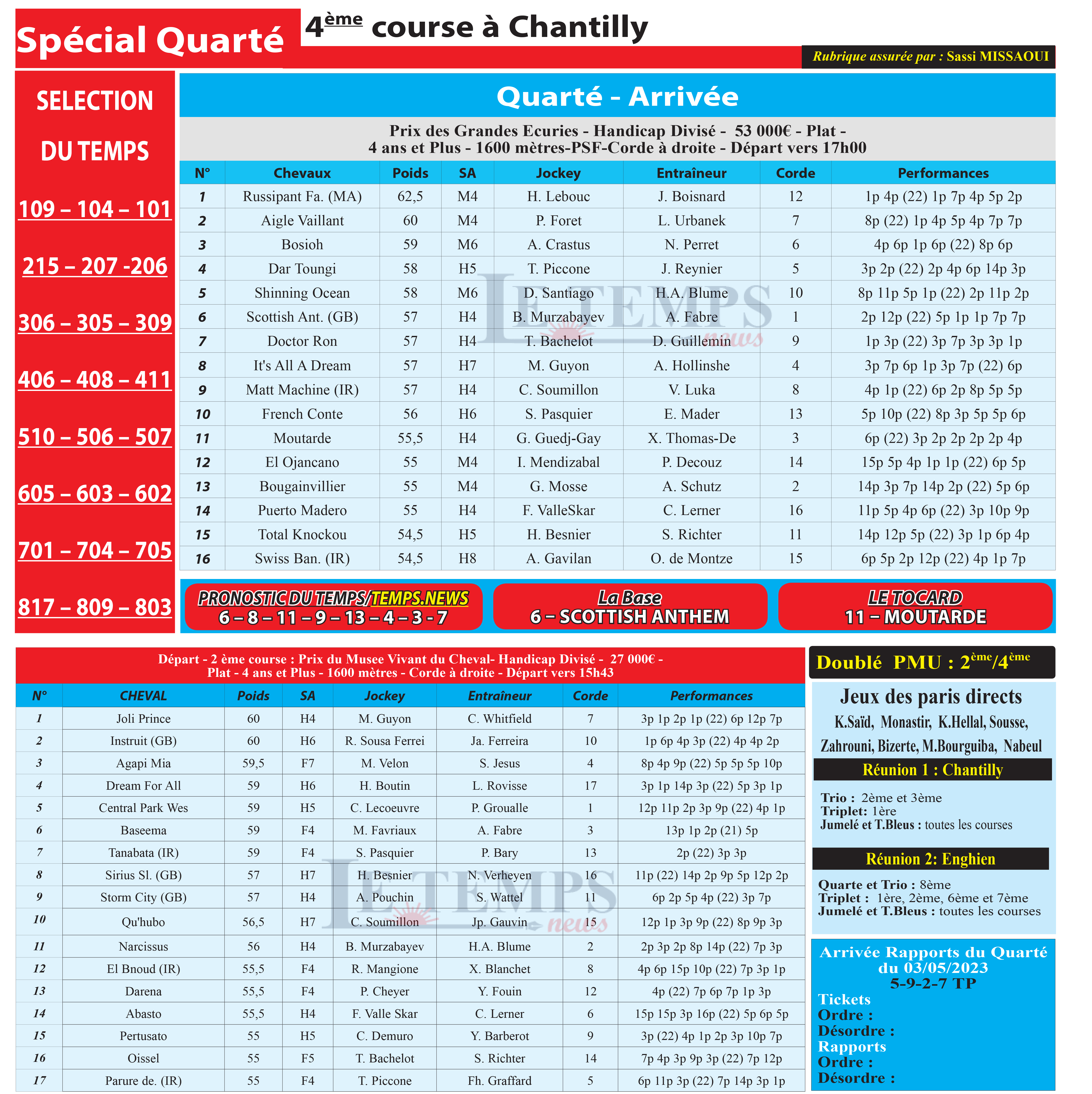 Notre spécial Quarté d’aujourd’hui, 4ème course à Chantilly, donne notre pronostic du Temps/ Temps News avec le cheval n°6 Scottish Anthem étant la base, tandis que le Tocard est le cheval n°11 Moutarde.