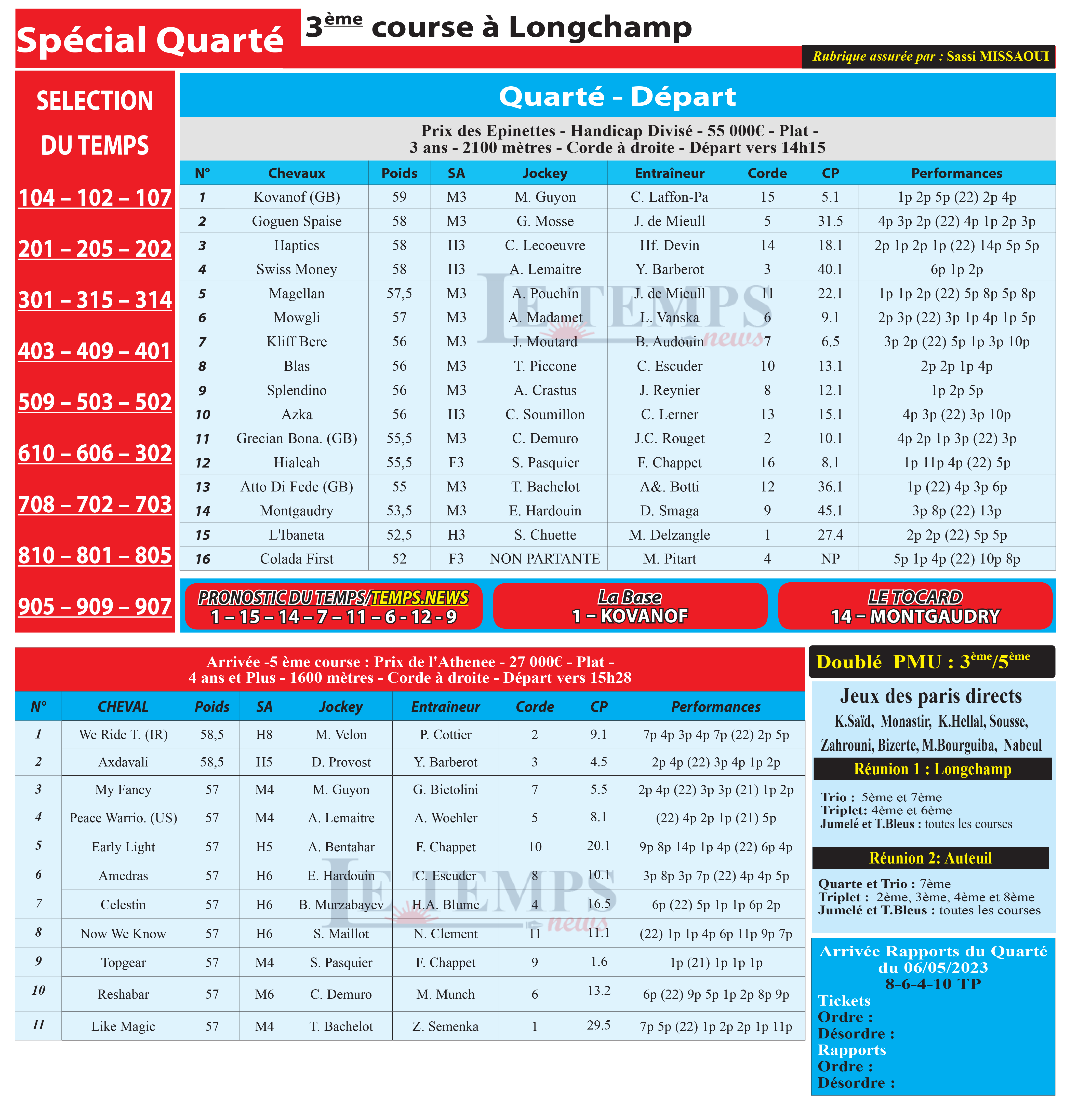 Partager Facebook Twitter LinkedIn Pinterest Email Notre spécial Quarté d’aujourd’hui, 3ème course à Longchamp, donne notre pronostic du Temps/ Temps News avec le cheval n°1 Kovanof étant la base, tandis que le Tocard est le cheval n°14 Montgaudry. PMU Turf
