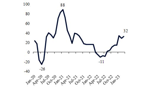 Selon l’Institute of International Finance (IIF), les flux de portefeuille des non-résidents vers les pays émergents, qui représentent les placements des investisseurs étrangers dans les actifs publics locaux, ont connu une évolution significative. Après une période de chiffres négatifs ou timides pendant la majeure partie de l’année 2022, ces flux ont augmenté pour atteindre une moyenne de plus de 30 milliards d’USD sur trois mois. Cet afflux de capitaux a contribué à des gains significatifs dans toutes les classes d’actifs des pays émergents, dont plus de 17 % de rendement total pour les actions (MSCI EM) et 14 % pour les obligations (J.P. Morgan EMBI Global) par rapport à leurs récents points bas.