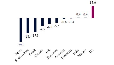 De nouveaux ajustements du dollar au cours des prochains trimestres devraient pousser les capitaux hors des États-Unis vers d’autres économies, car un dollar plus faible favorise les portefeuilles diversifiés à l’échelle mondiale. Cela devrait être particulièrement bénéfique pour les économies avancées dont les monnaies sont sous-évaluées, comme le Japon, le Canada, le Royaume-Uni, la zone euro et l’Australie. Toutefois, les pays émergents dont les monnaies flottantes sont sous-évaluées devraient également en bénéficier, notamment l’Afrique du Sud et le Brésil. En fait, une diversification générale par rapport au dollar devrait favoriser tous les pays, y compris les autres pays émergents.