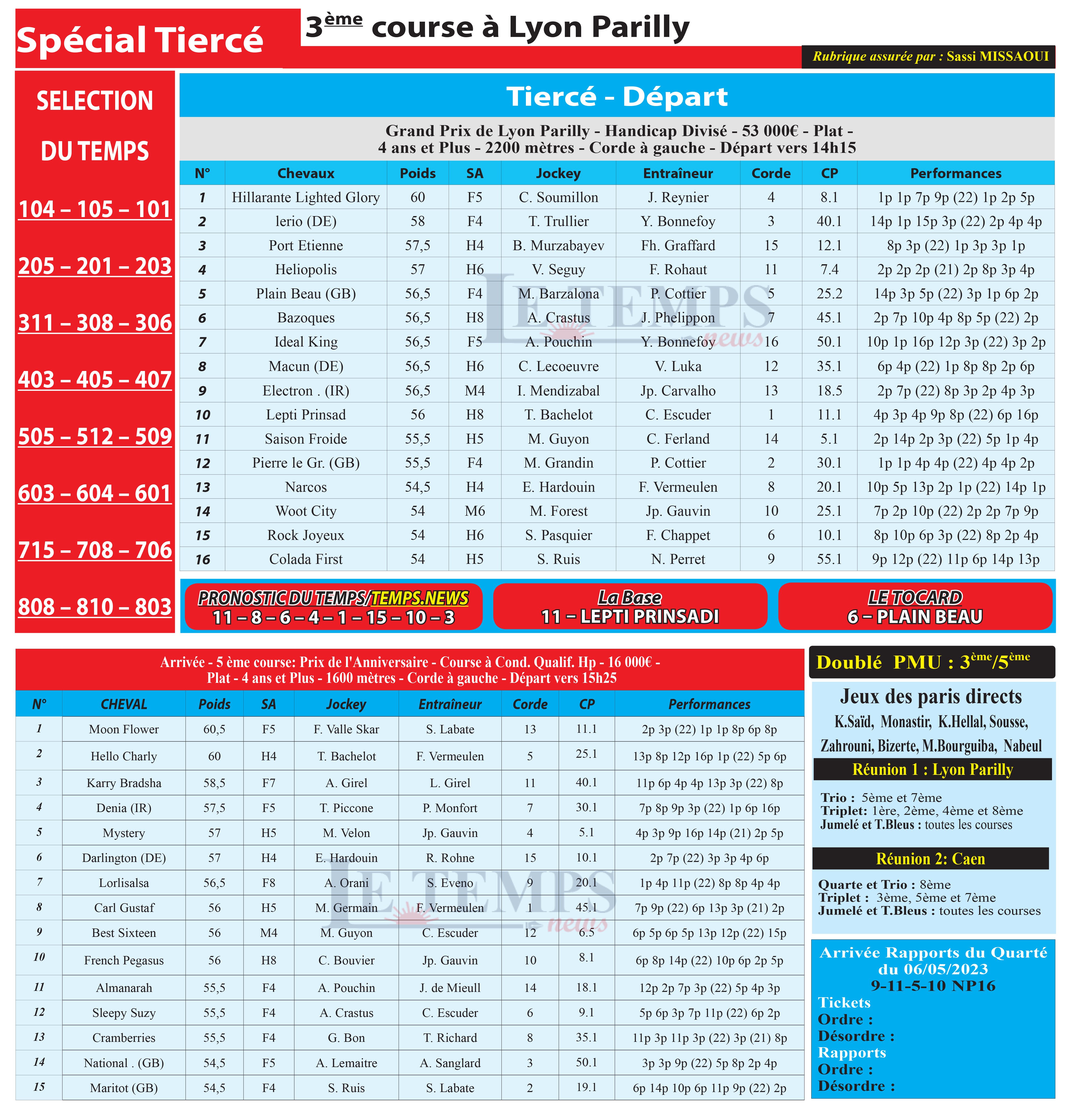 Partager Facebook Twitter LinkedIn Pinterest Email Notre spécial Tiercé d’aujourd’hui, 3ème course à Lyon Parilly, donne notre pronostic du Temps/ Temps News avec le cheval n°11 Lepti Prinsadi étant la base, tandis que le Tocard est le cheval n°6 Plain Beau. PMU Turf