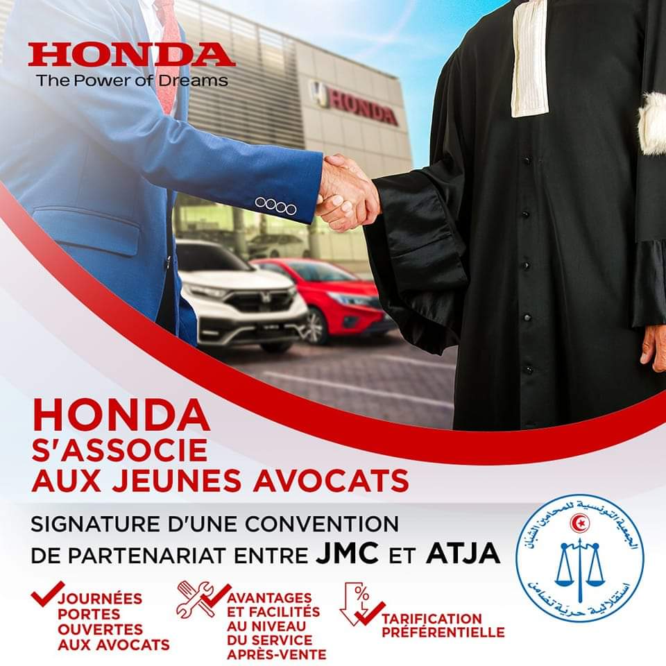 La société Japanese Motors Company (JMC), concessionnaire agréé en Tunisie pour les véhicules particuliers du constructeur automobile japonais Honda, est fière d’annoncer la signature d’une convention de partenariat avec l’Association Tunisienne des Jeunes Avocats (ATJA).