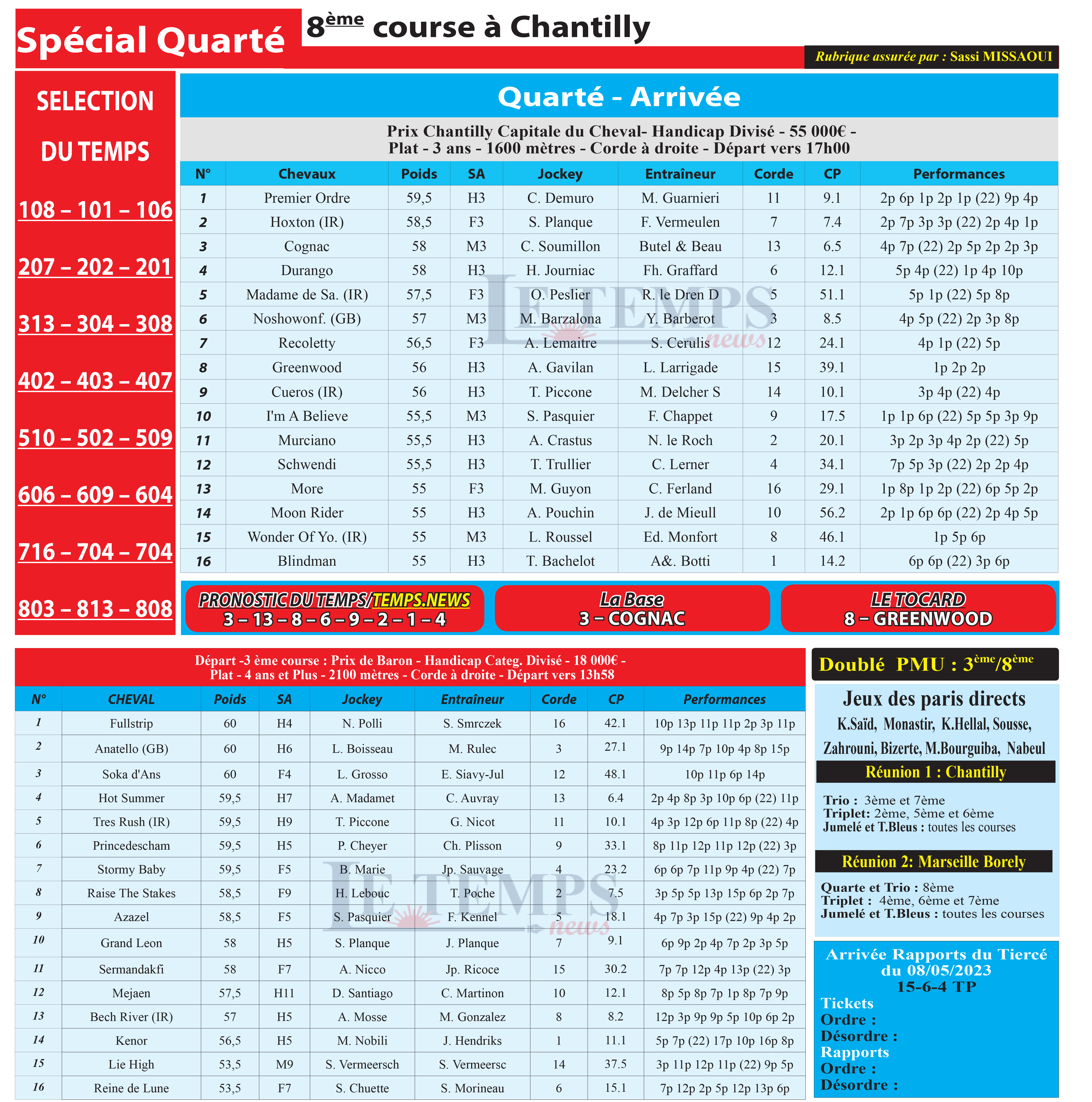 Notre spécial Quarté d’aujourd’hui, 8ème course à Chantilly, donne notre pronostic du Temps/ Temps News avec le cheval n°3 Cognac étant la base, tandis que le Tocard est le cheval n°8 Greenwood.