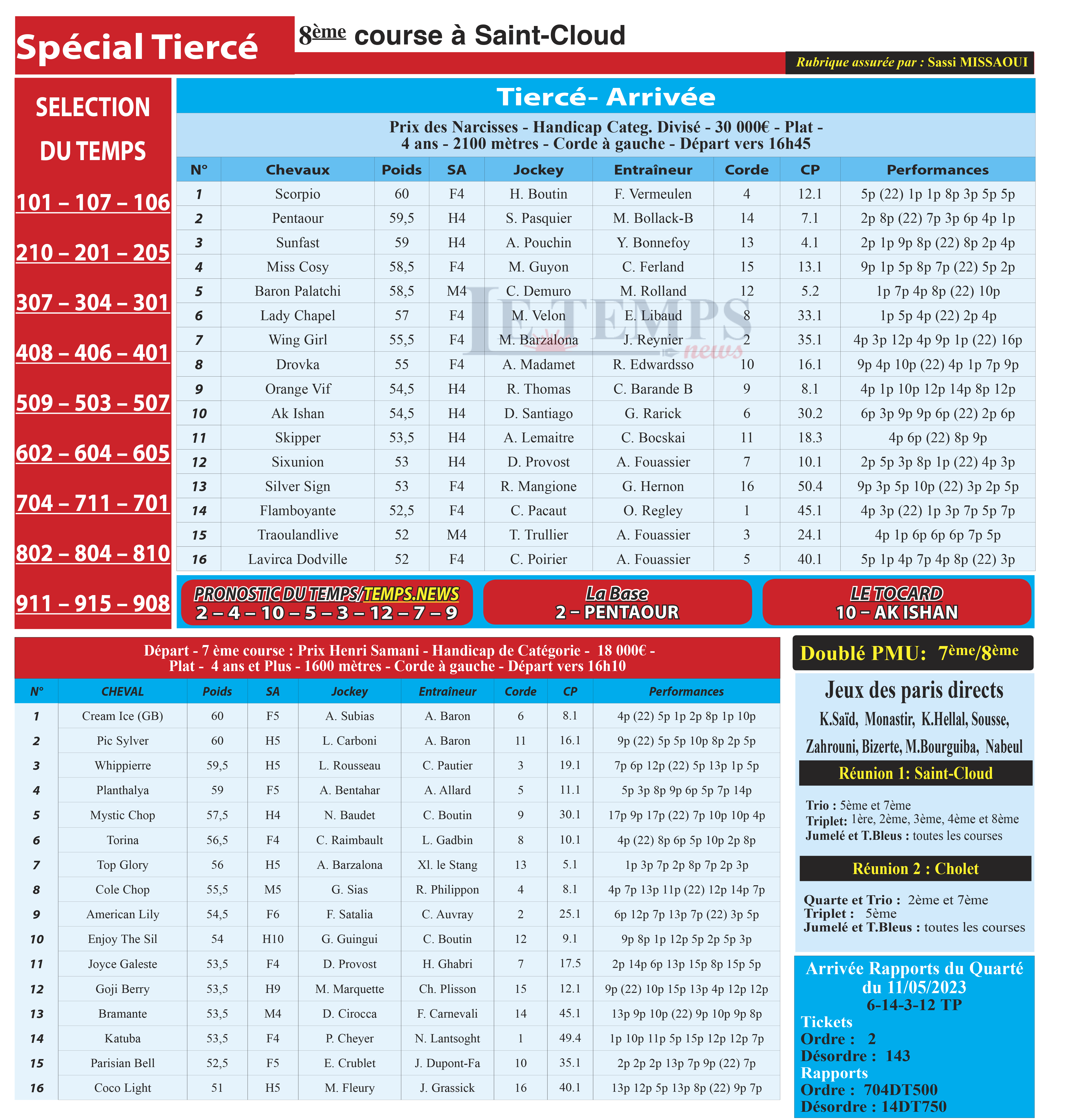 Partager Facebook Twitter LinkedIn Pinterest Email Notre spécial Tiercé d’aujourd’hui, 8ème course à Saint-Cloud, donne notre pronostic du Temps/ Temps News avec le cheval n°2 Pentaour étant la base, tandis que le Tocard est le cheval n°10 Ak Ishan. PMU Turf