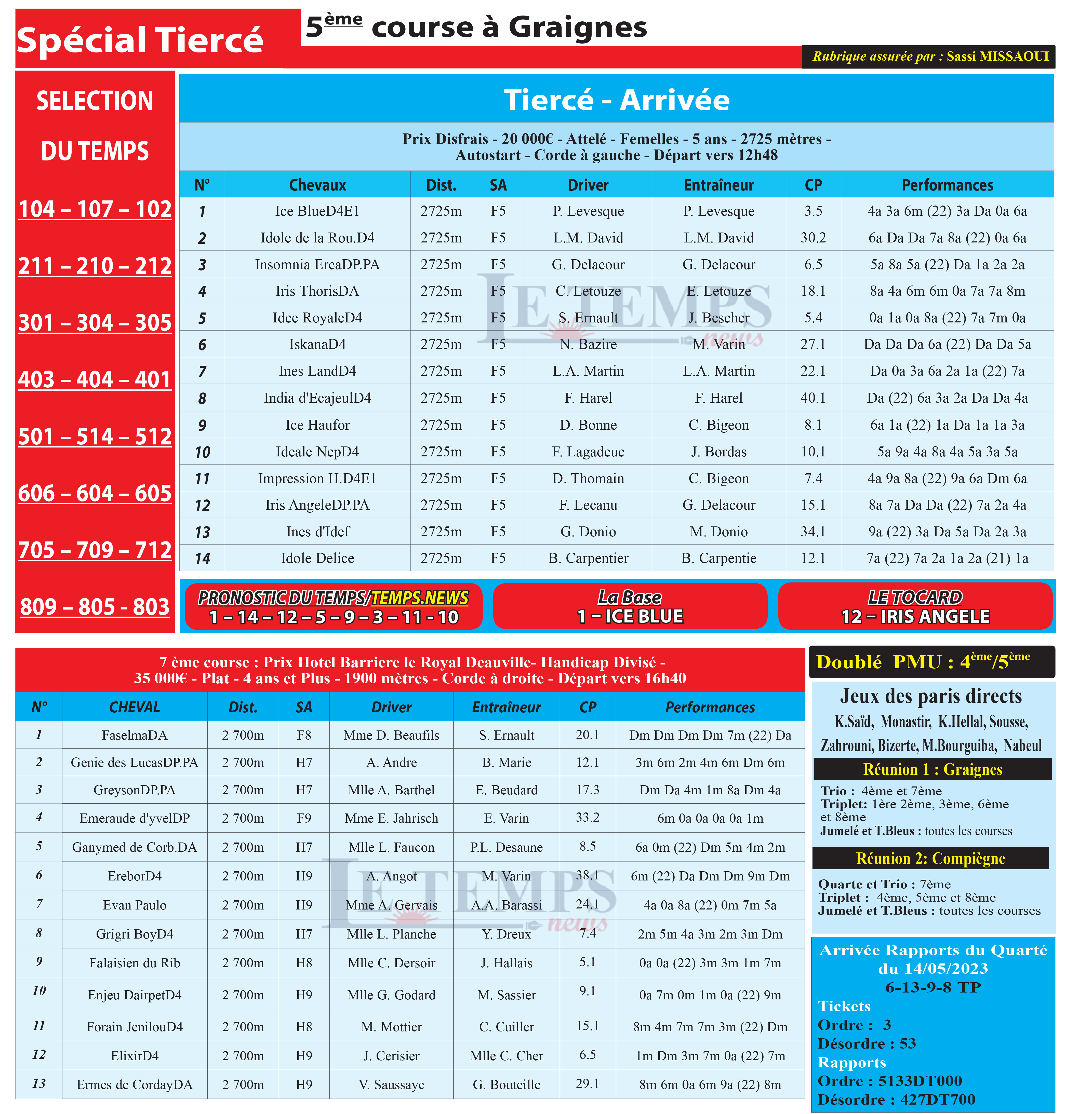Partager Facebook Twitter LinkedIn Pinterest Email Notre spécial Tiercé d’aujourd’hui, 5ème course à Graignes, donne notre pronostic du Temps/ Temps News avec le cheval n°1 Ice Blue étant la base, tandis que le Tocard est le cheval n°12 Iris Angele. PMU Turf