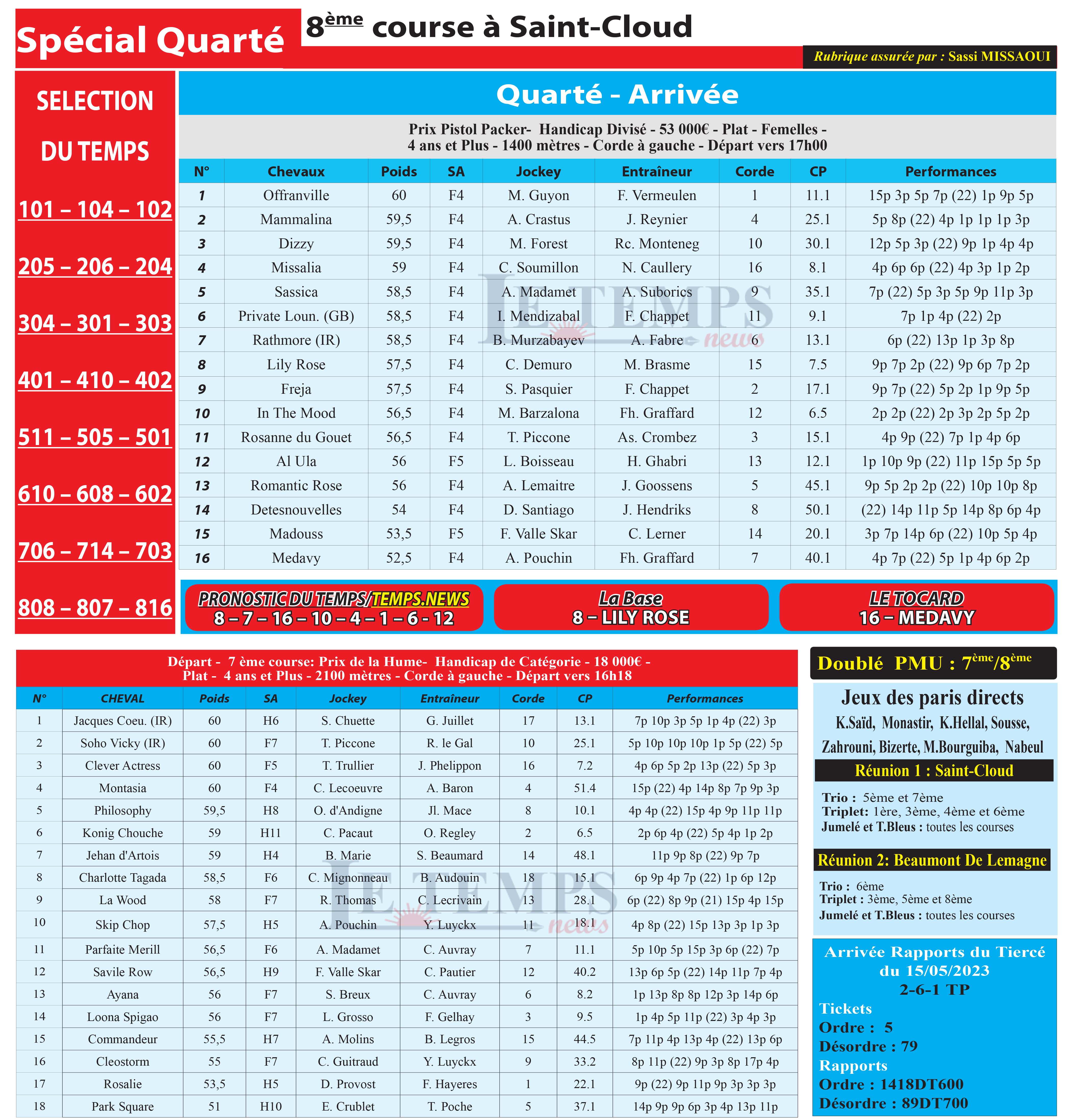 Notre spécial Quarté d’aujourd’hui, 8ème course à Saint-Cloud, donne notre pronostic du Temps/ Temps News avec le cheval n°8 Lily Rose étant la base, tandis que le Tocard est le cheval n°16 Medavy.