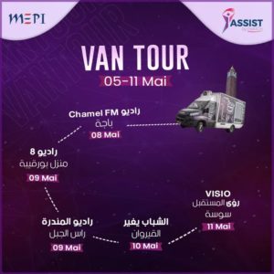 Durant la période allant du 05 au 11 mai courant, la tournée du studio mobile, lancée dans le cadre de l’action « Van Tour 2.0 » a touché les régions suivantes : Béja, Menzel Bourguiba et Ras Jebel de Bizerte, Kairouan et Sousse.