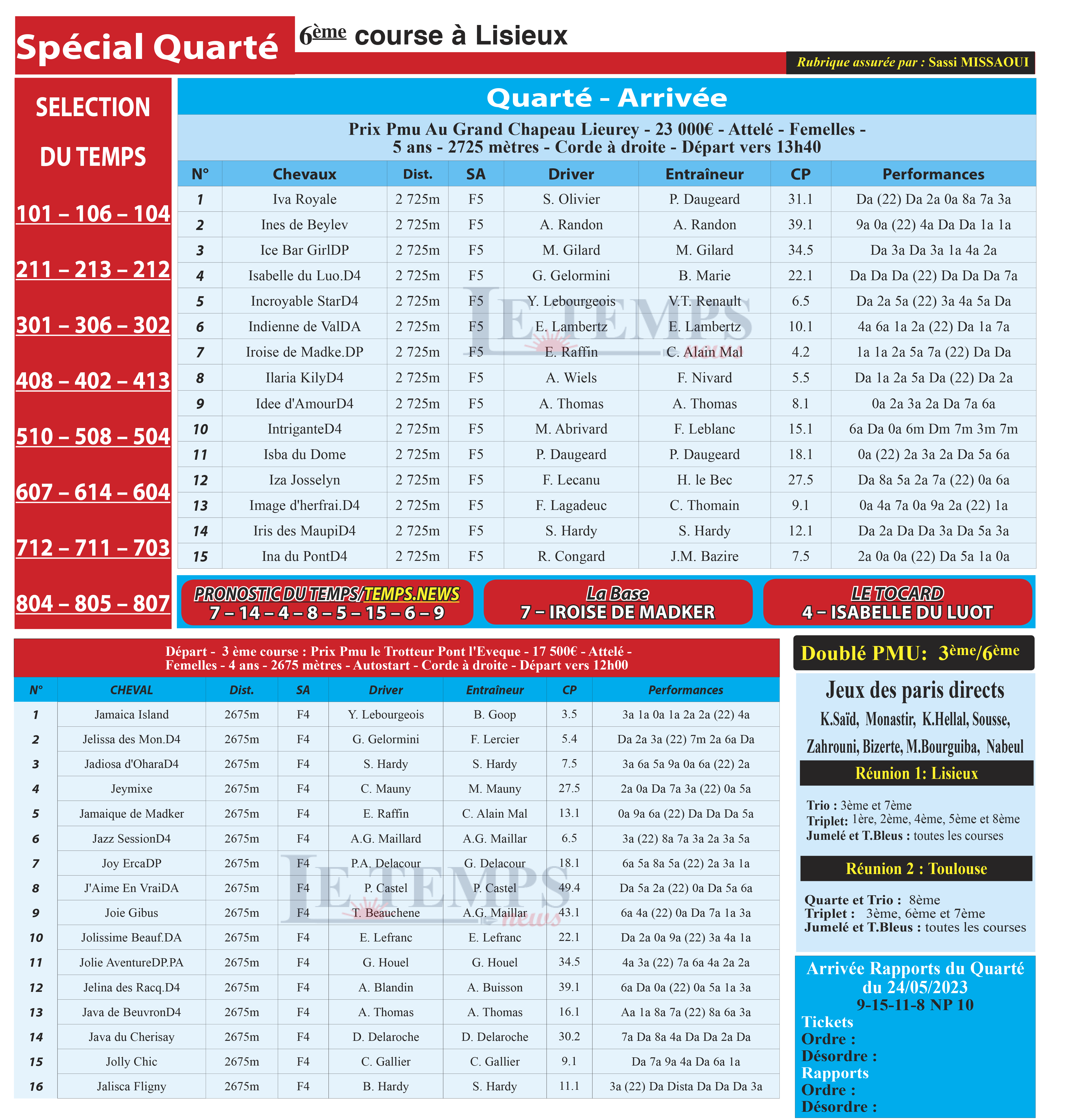 Notre spécial Quarté d’aujourd’hui, 6ème course à Lisieux, donne notre pronostic du Temps/ Temps News avec le cheval n°7 Iroise De Madker étant la base, tandis que le Tocard est le cheval n°4 Isabelle Du Luot.
