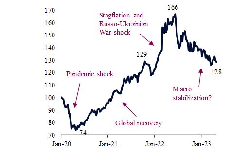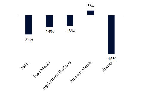 Les marchés des matières premières ont été particulièrement volatils depuis le début de l’année 2020. Le choc négatif de la demande dû à la pandémie de Covid-19 a d’abord déclenché des pressions déflationnistes qui ont rapidement poussé les prix des produits de base à des niveaux planchers sur plusieurs décennies. L’indice Bloomberg Commodity Index, une référence majeure pour les mouvements généraux des prix des matières premières, s’est effondré de janvier à la fin du mois d’avril 2020. Toutefois, il n’a pas fallu longtemps pour que des mesures de relance sans précédent stimulent une reprise économique mondiale significative, qui a soutenu les prix des produits de base. Après une période de reprise économique saine, la demande mondiale excédentaire, combinée aux contraintes de l’offre et au choc de la guerre russo-ukrainienne, a entraîné une spirale de prix élevés à la fin de l’année 2021 et au début de l’année 2022. Les prix élevés des produits de base semblaient avoir atteint leur apogée au milieu de l’année dernière, avant une correction significative qui est toujours en cours.
