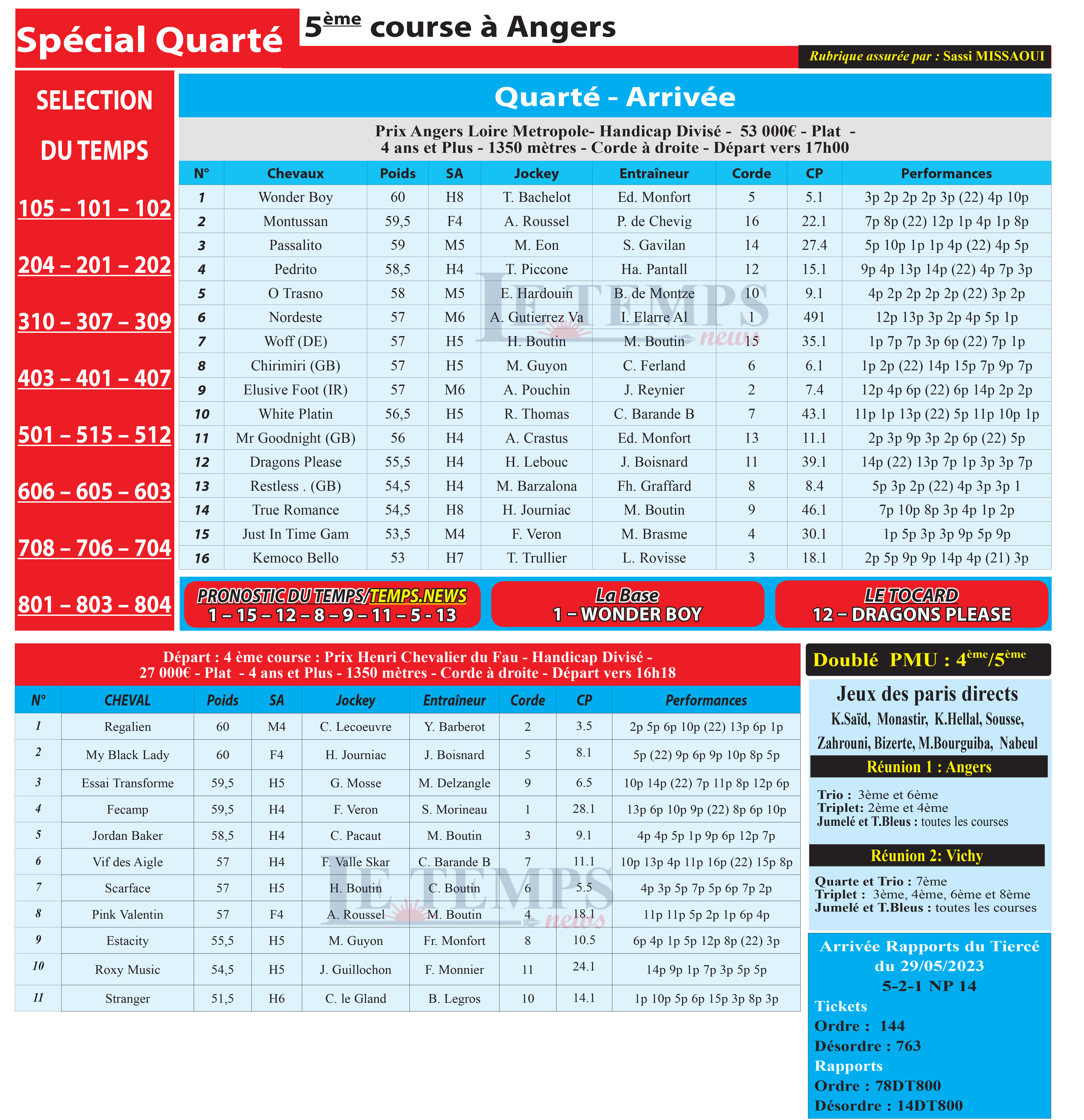Partager Facebook Twitter LinkedIn Pinterest Email Notre spécial Quarté d’aujourd’hui, 5ème course à Angers, donne notre pronostic du Temps/ Temps News avec le cheval n°1 Wonder Boy étant la base, tandis que le Tocard est le cheval n°12 Dragon Please. PMU Turf