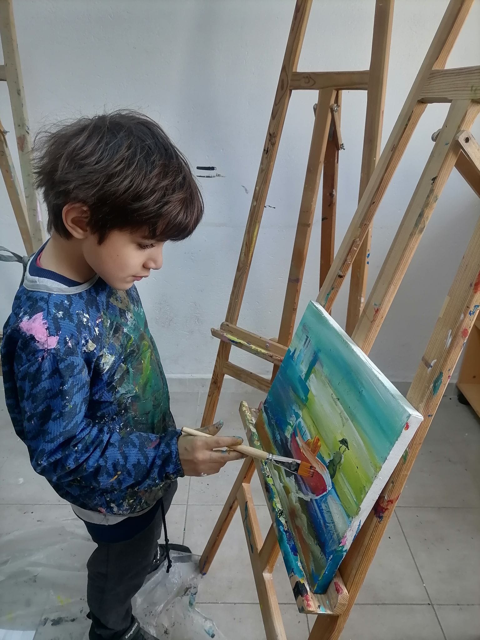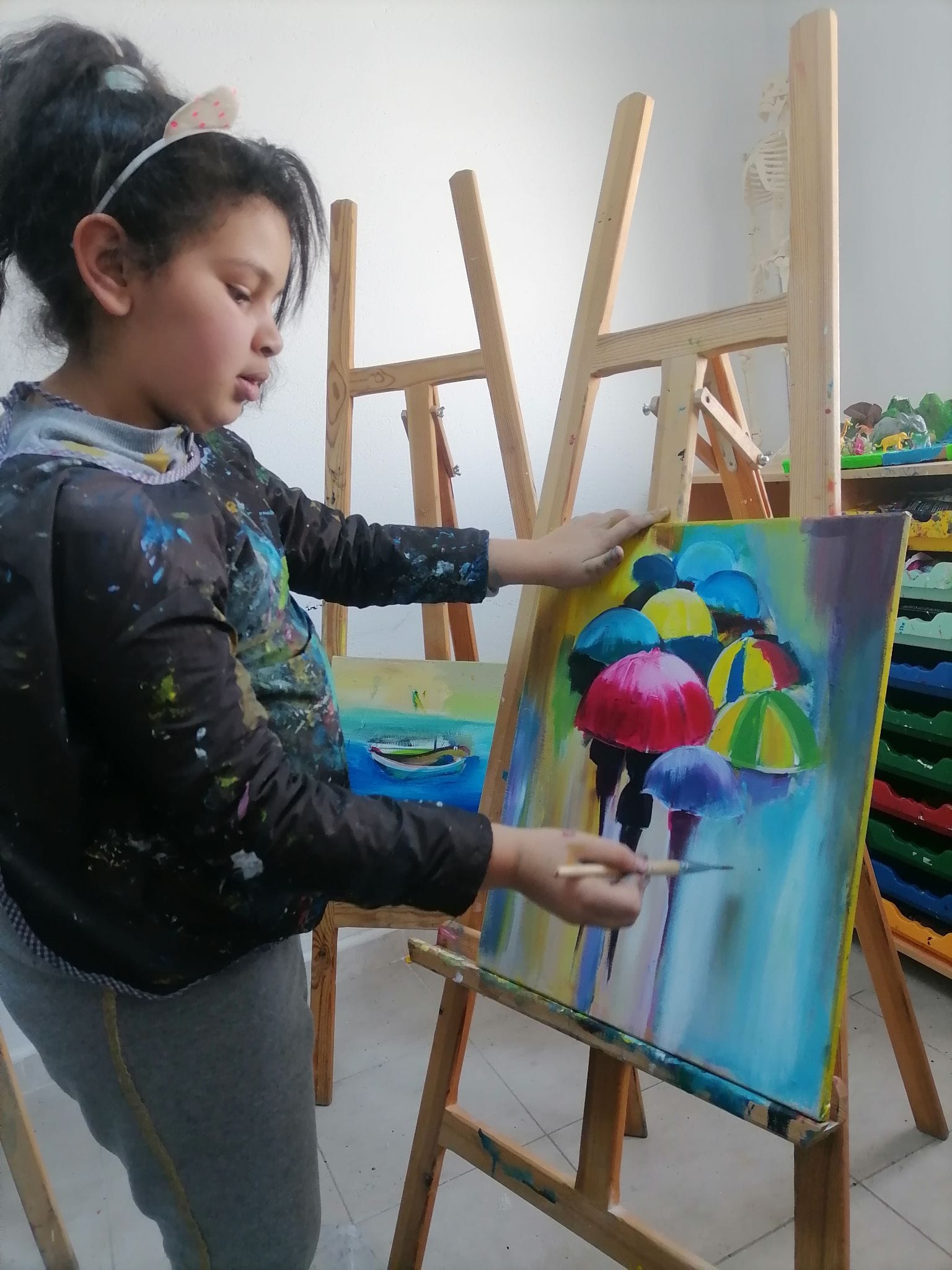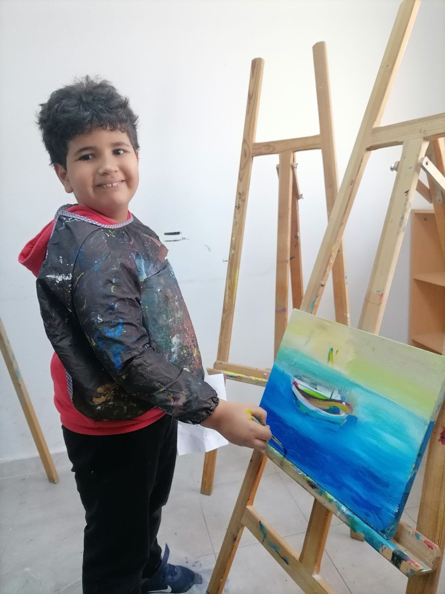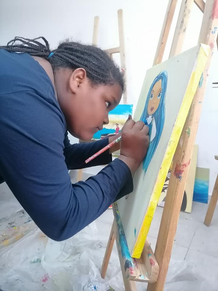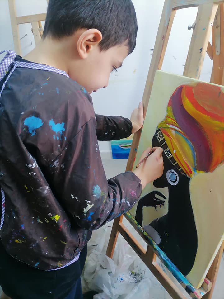 Les jeunes peintres Ayhem, Adnen, Hédi, Sofia et Rayen s’affirment et montrent des dispositions picturales réelles. Ces plasticiens en herbe, cherchent  à dominer l’espace de ses toiles en y inscrivant des éléments géométriques tout en laissant les plages de couleurs très libres .Ils  se proposent de continuer leur effort pour atteindre une qualité plastique et un niveau d’expressivité artistique non négligeable. « Nous avons beaucoup appris . À cet âge, on a beaucoup d’imagination,  Grâce à l’atelier, nous avons appris plein de techniques et  rencontré d’autres jeunes, c’est super pour s’intégrer », racontent–ils.