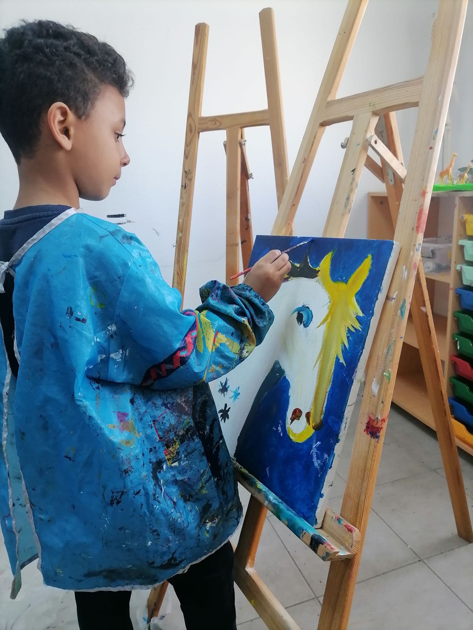 L’activité dessin, proposée aux enfants par The Bridge School, accueille chaque mercredi matin, un groupe de 15 jeunes apprentis plasticiens. Les cours sont, cette année, dispensés par Aida Ben Romdhane. Avec son groupe d’élèves, Aida  essaie de mettre en pratique et d’utiliser toutes les techniques (peintures, découpages, pastels, etc.), de façon à ce que les enfants touchent un peu à tout ce qui se fait en la matière. A partir des bases de travail fixées par l’encadrante, les enfants font beaucoup travailler leur imagination et sont souvent très porteurs d’idées. Aussi essaye-t-elle de s’adapter autant que possible à leurs demandes.