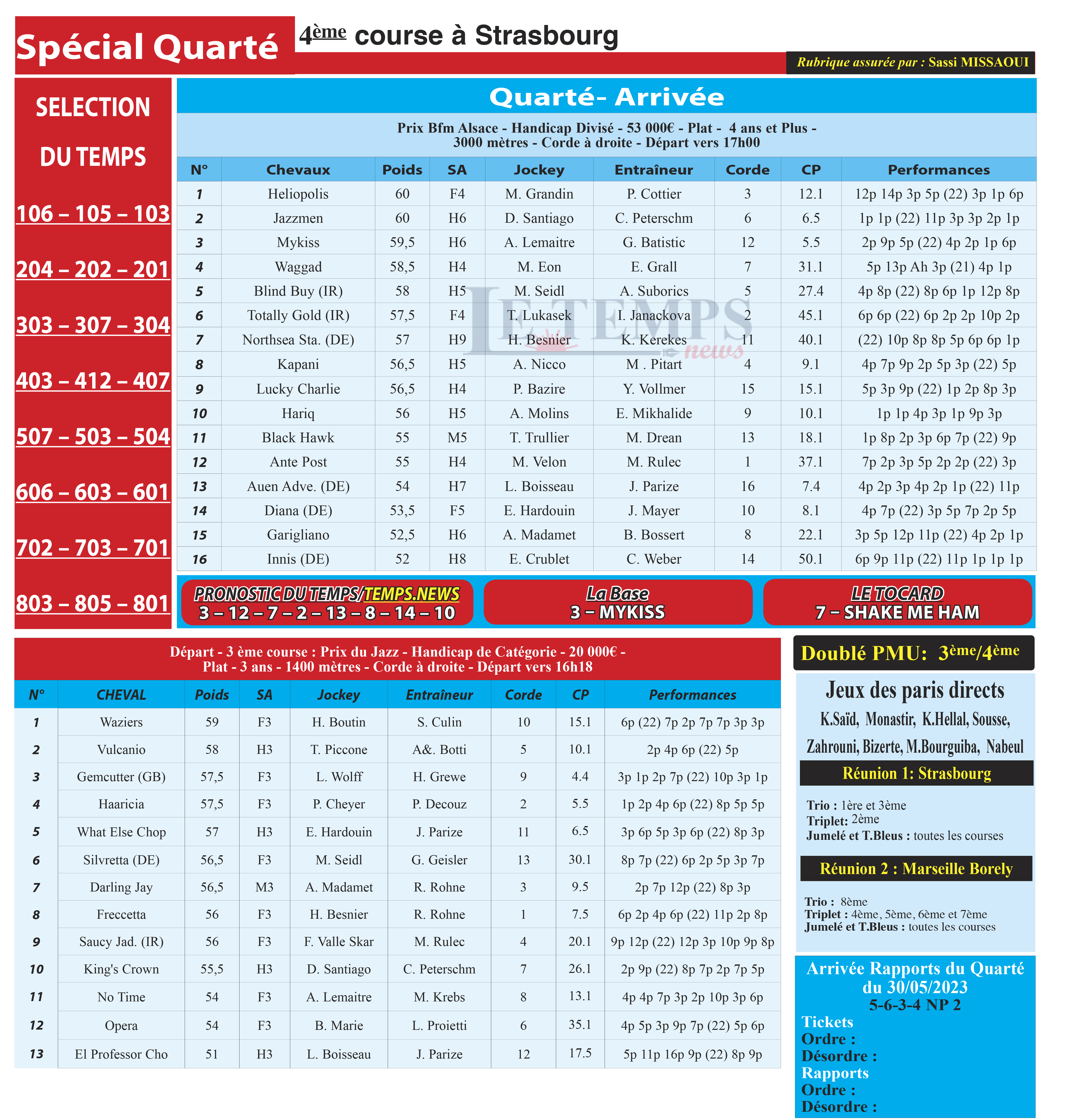 Partager Facebook Twitter LinkedIn Pinterest Email Notre spécial Quarté d’aujourd’hui, 4ème course à Strasbourg, donne notre pronostic du Temps/ Temps News avec le cheval n°3 Mykiss étant la base, tandis que le Tocard est le cheval n°7 Shake Me Ham. PMU Turf