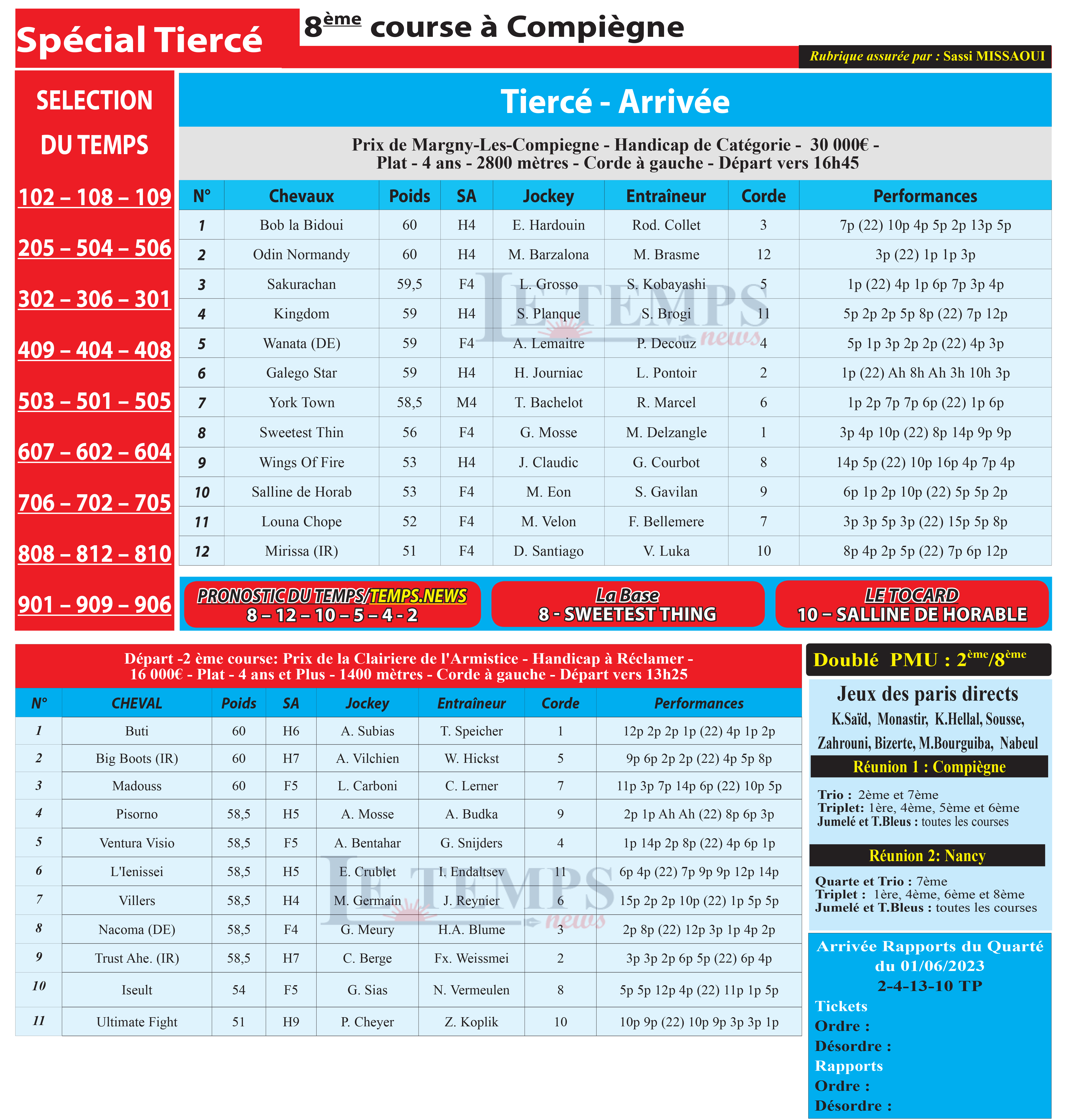 Notre spécial Tiercé d’aujourd’hui, 8ème course à Compiègne, donne notre pronostic du Temps/ Temps News avec le cheval n°8 Sweetest Thing étant la base, tandis que le Tocard est le cheval n°10 Salline De Horable.