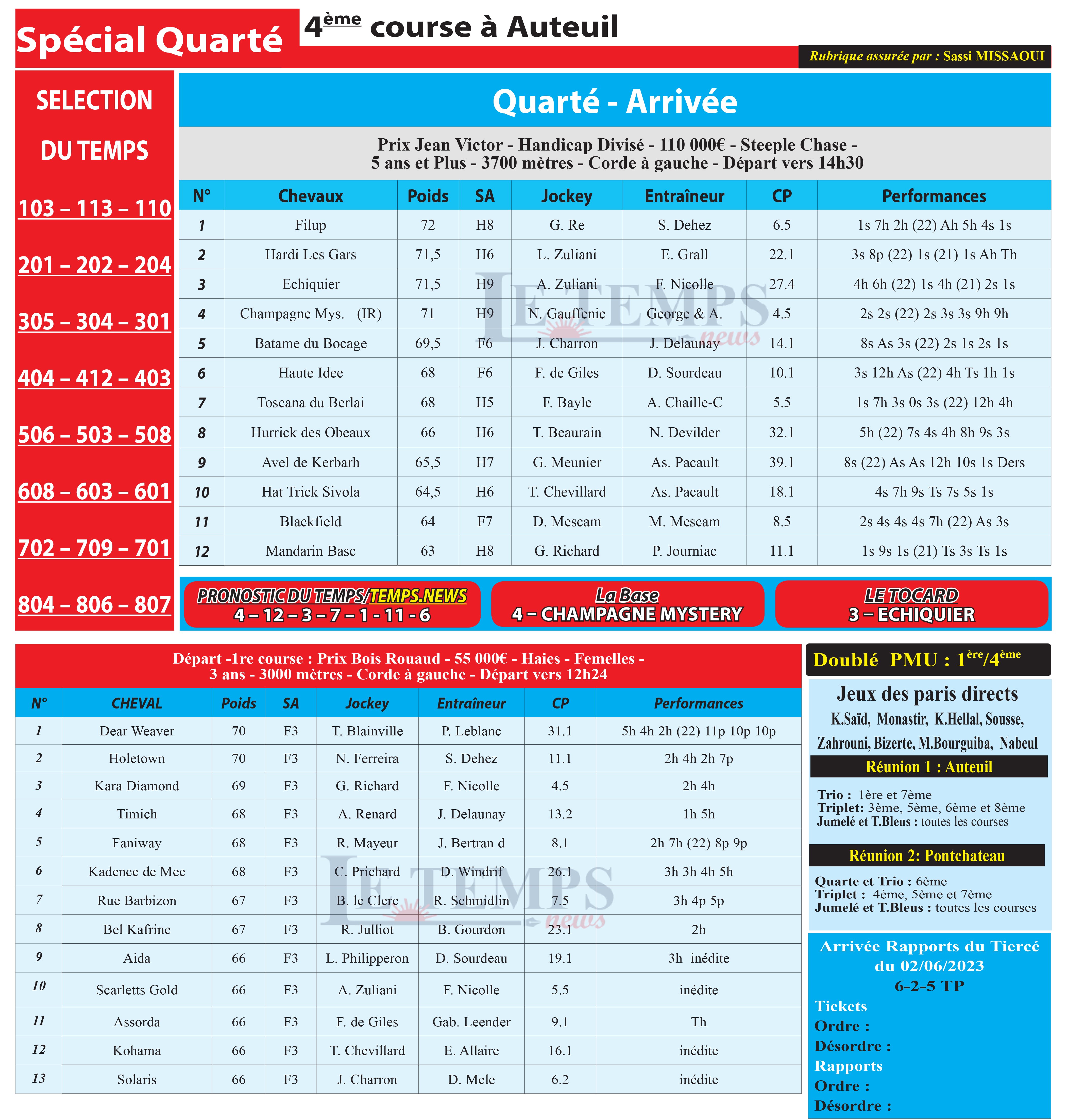 Notre spécial Quarté d’aujourd’hui, 4ème course à Auteuil, donne notre pronostic du Temps/ Temps News avec le cheval n°4 Champagne Mystery étant la base, tandis que le Tocard est le cheval n°3 Echiquier.