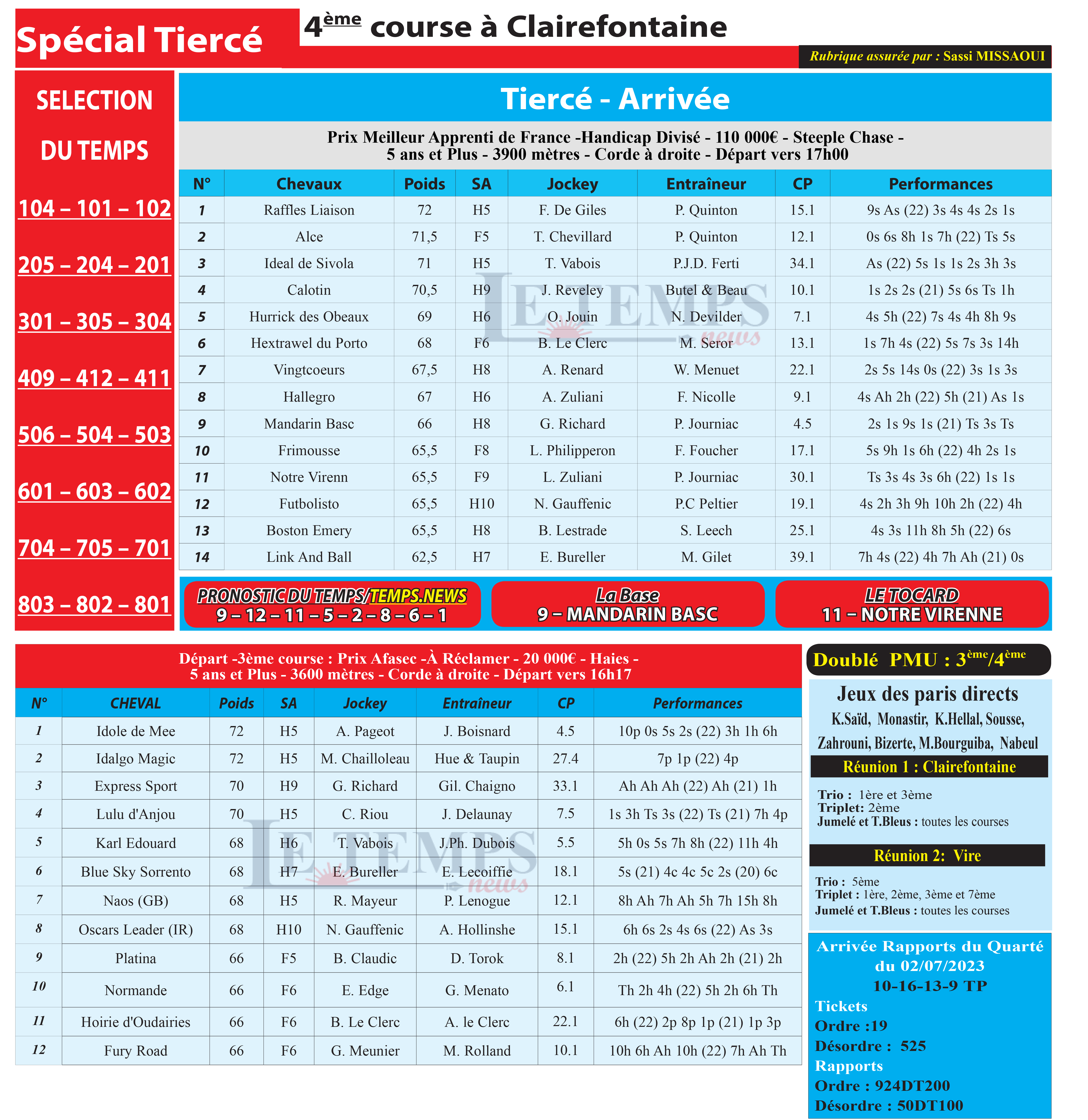 Notre spécial Tiercé d’aujourd’hui, 4ème course à Clairefontaine, donne notre pronostic du Temps/ Temps News avec le cheval n°9 Mandarin Basc étant la base, tandis que le Tocard est le cheval n°11 Notre Virenne.