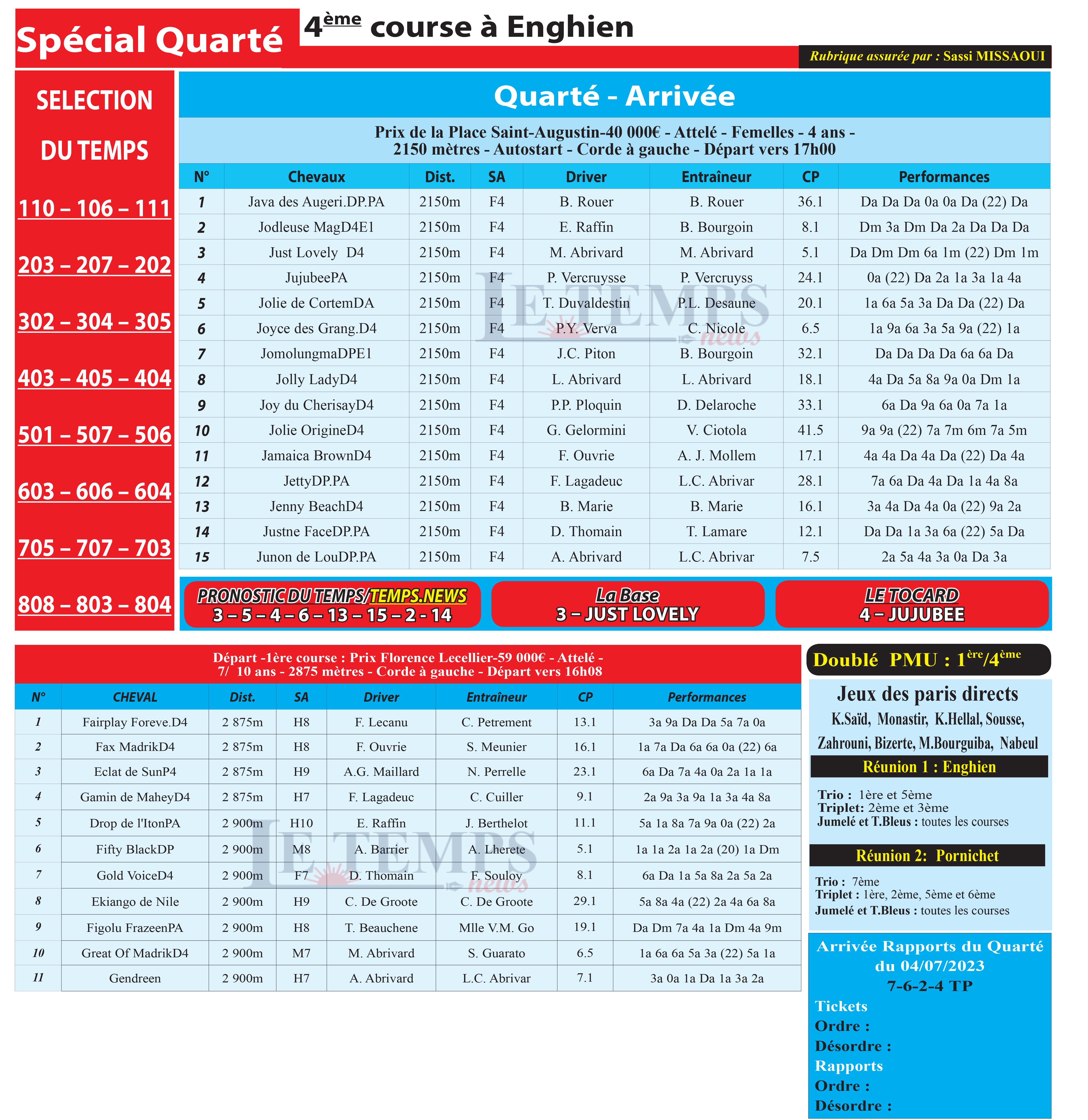 Partager Facebook Twitter LinkedIn Pinterest Email Notre spécial Quarté d’aujourd’hui, 4ème course à Enghien, donne notre pronostic du Temps/ Temps News avec le cheval n°3 Just Lovely étant la base, tandis que le Tocard est le cheval n°4 Jujubee. PMU Turf